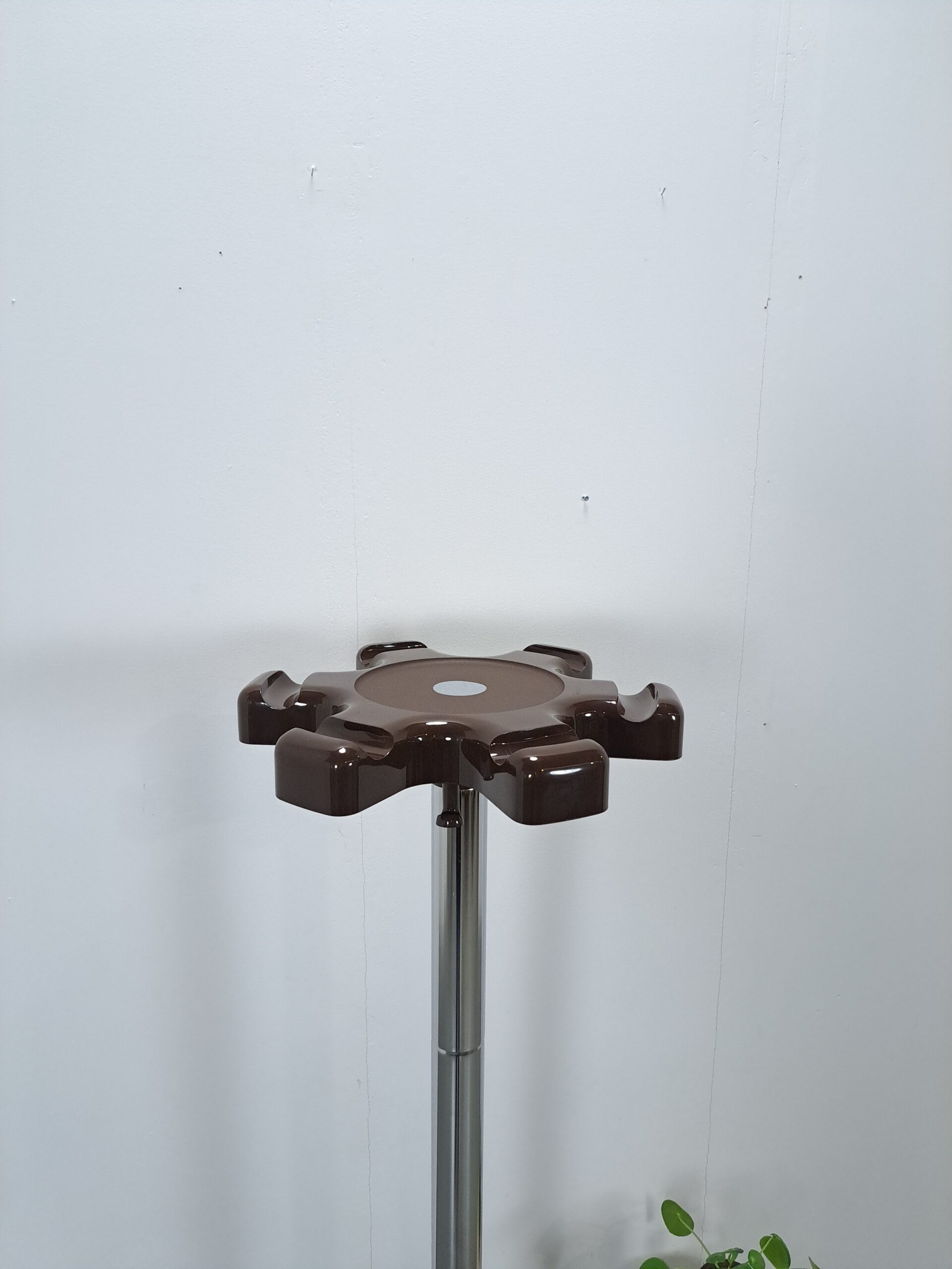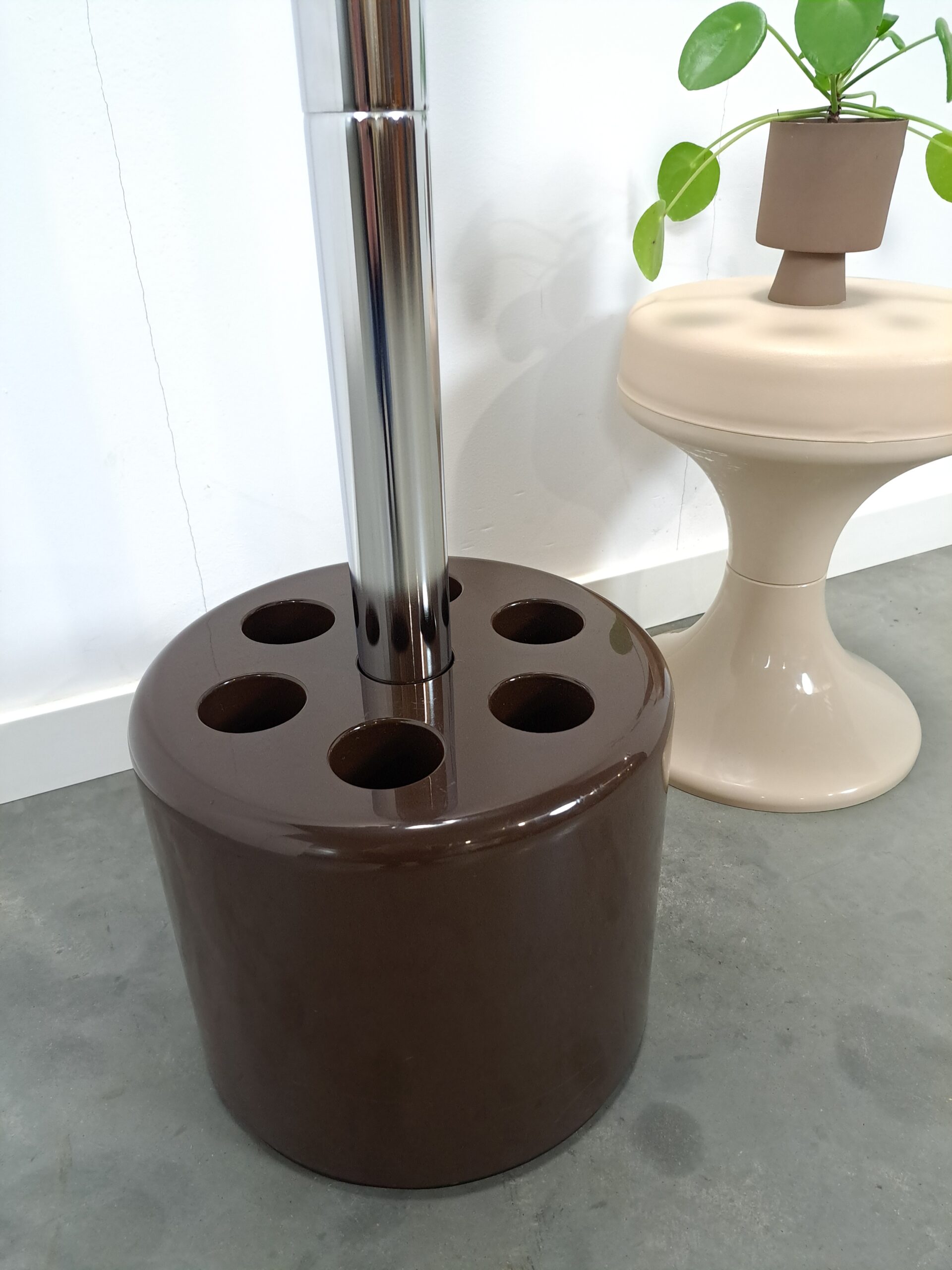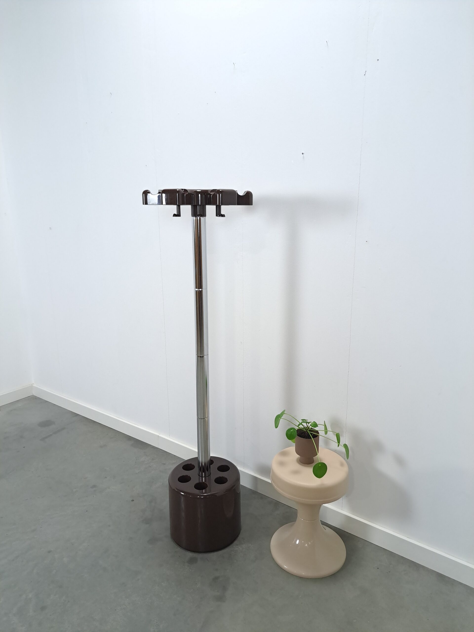 Stijlvolle vintage kapstok uit de jaren 60/70 in Italië. De kapstok is ontworpen door Roberto Lucci en Paolo Orlandini voor het Italiaanse merk Velca en het betreft het model VIP. De kapstok bestaat uit een verzwaarde deels kunststoffen voet en kap met haken en een chromen houder. Er is ruimte voor het opbergen van jassen, tassen en paraplu’s.