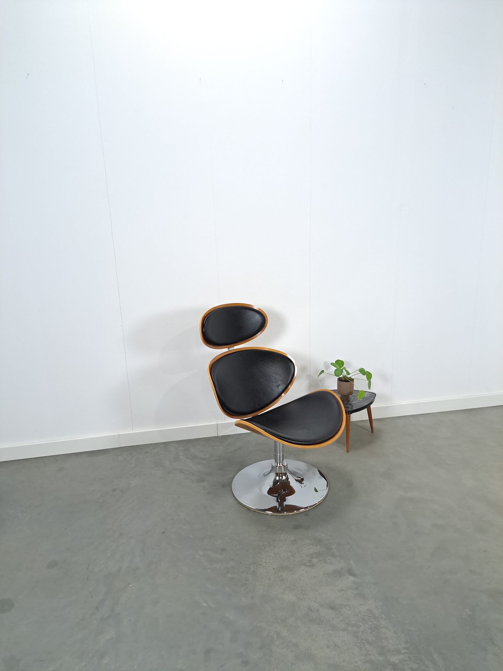 De Dan‑Form Curve loungestoel is een stijlvolle Deense draaifauteuil met een elegante, organische vormgeving. De stoel combineert hoog zitcomfort met modern design en heeft zwart vermoedelijk kunstleren bekleding. Dankzij het slanke silhouet en het draaibare chromen onderstel is deze fauteuil een tijdloze eyecatcher voor woonkamer, kantoor of leeshoek.