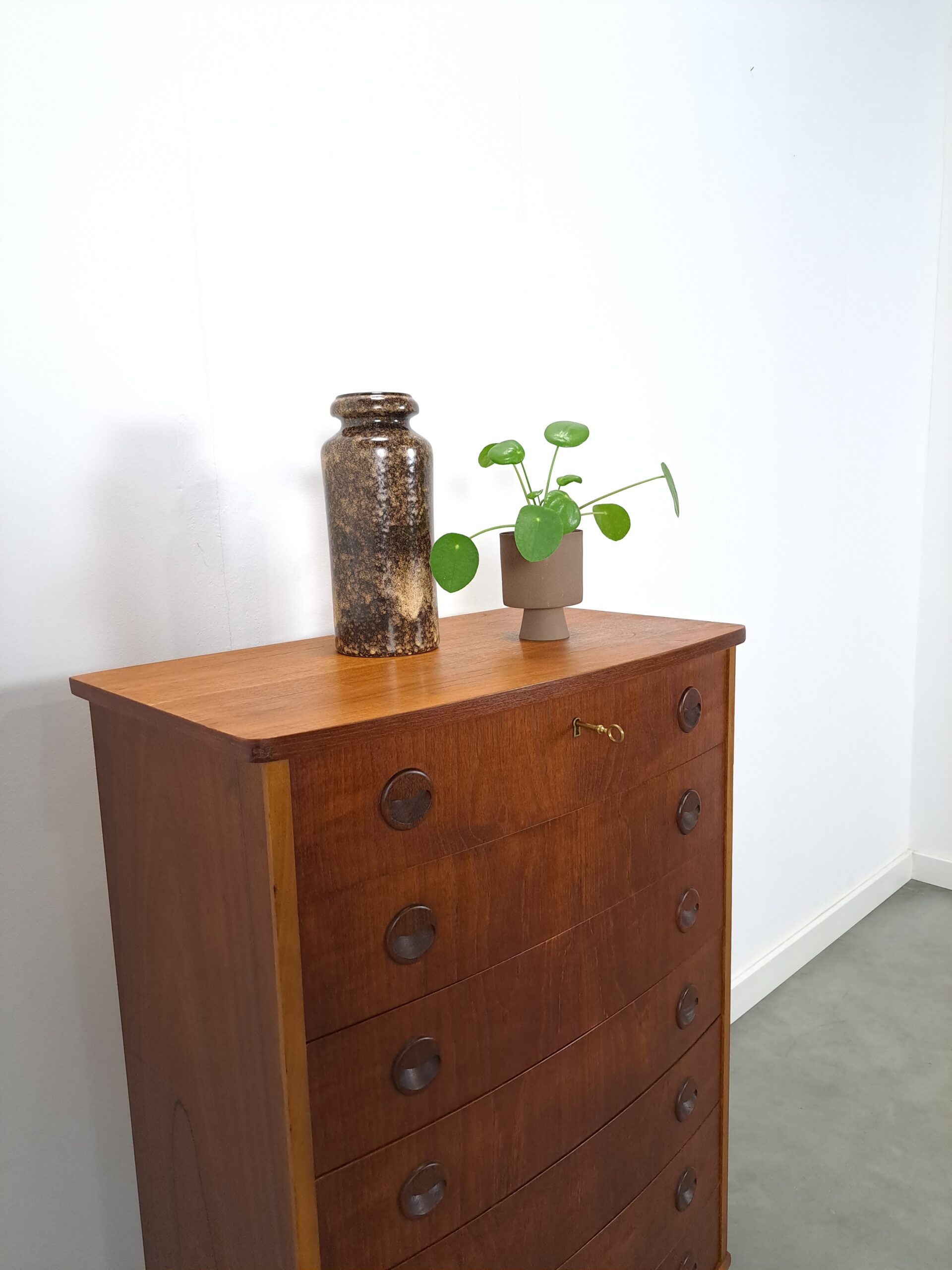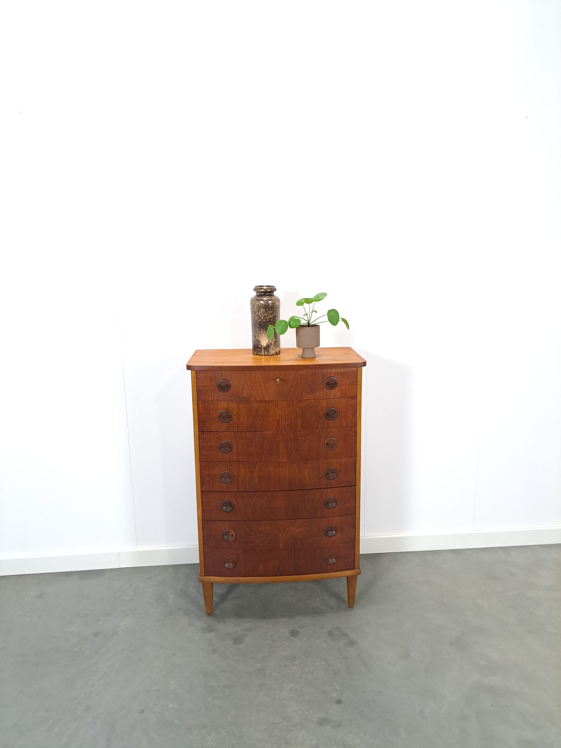 Deze vintage ladekast komt uit Denemarken en heeft een mooi gebogen voorkant en zeven ruime lades met ronde grepen. De Deense ladekast is ideaal voor in de woonkamer, hal of slaapkamer dankzij de fijne opbergruimte en het tijdloze uiterlijk.