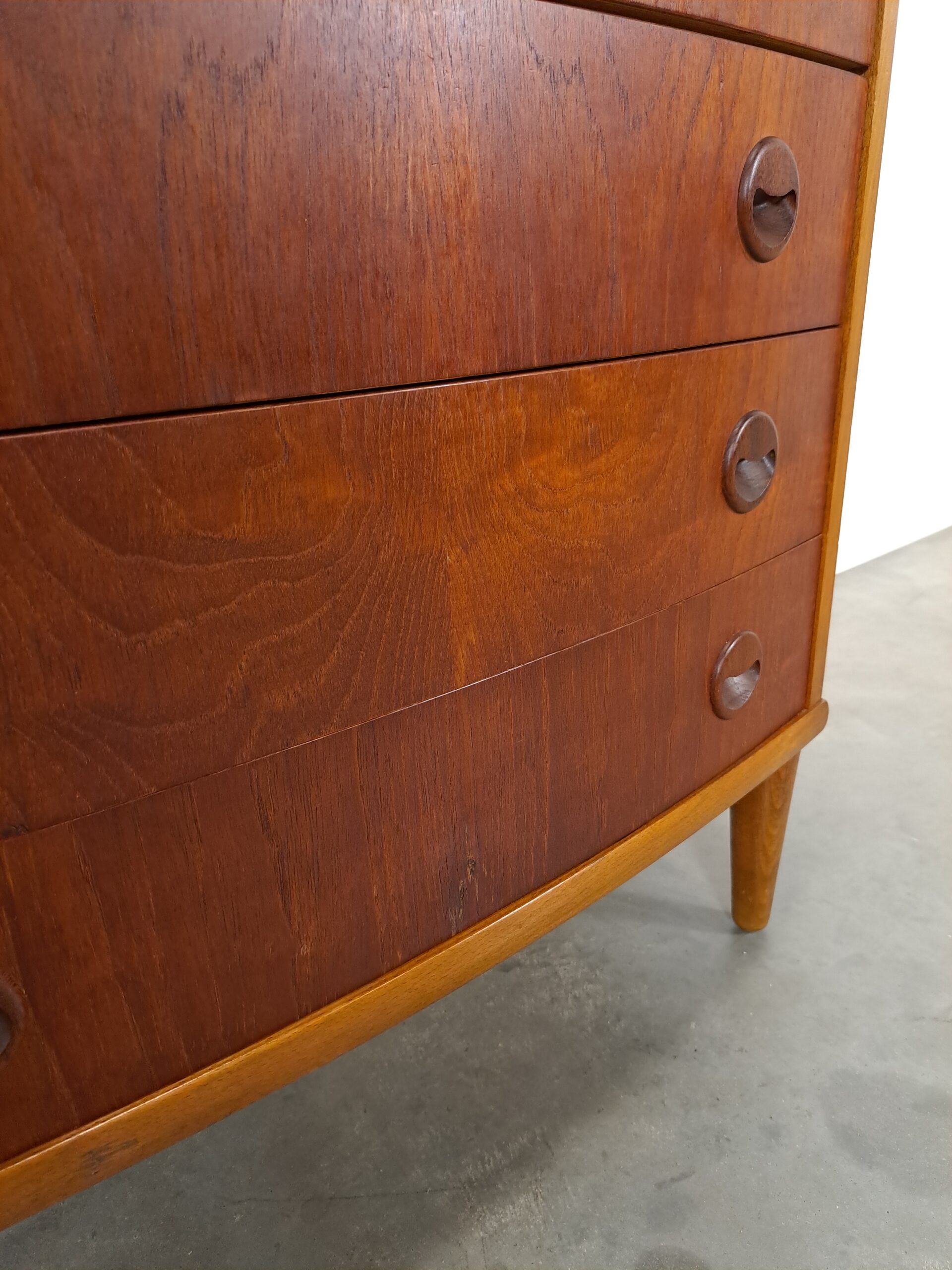 De ladekast is in een goede conditie, met duidelijke gebruikssporen, passend bij de vintage leeftijd. Rondom zitten er beschadigingen aan de fineer toplaag. Op de linker hoek aan de bovenkant, zit een beschadiging aan het hout.