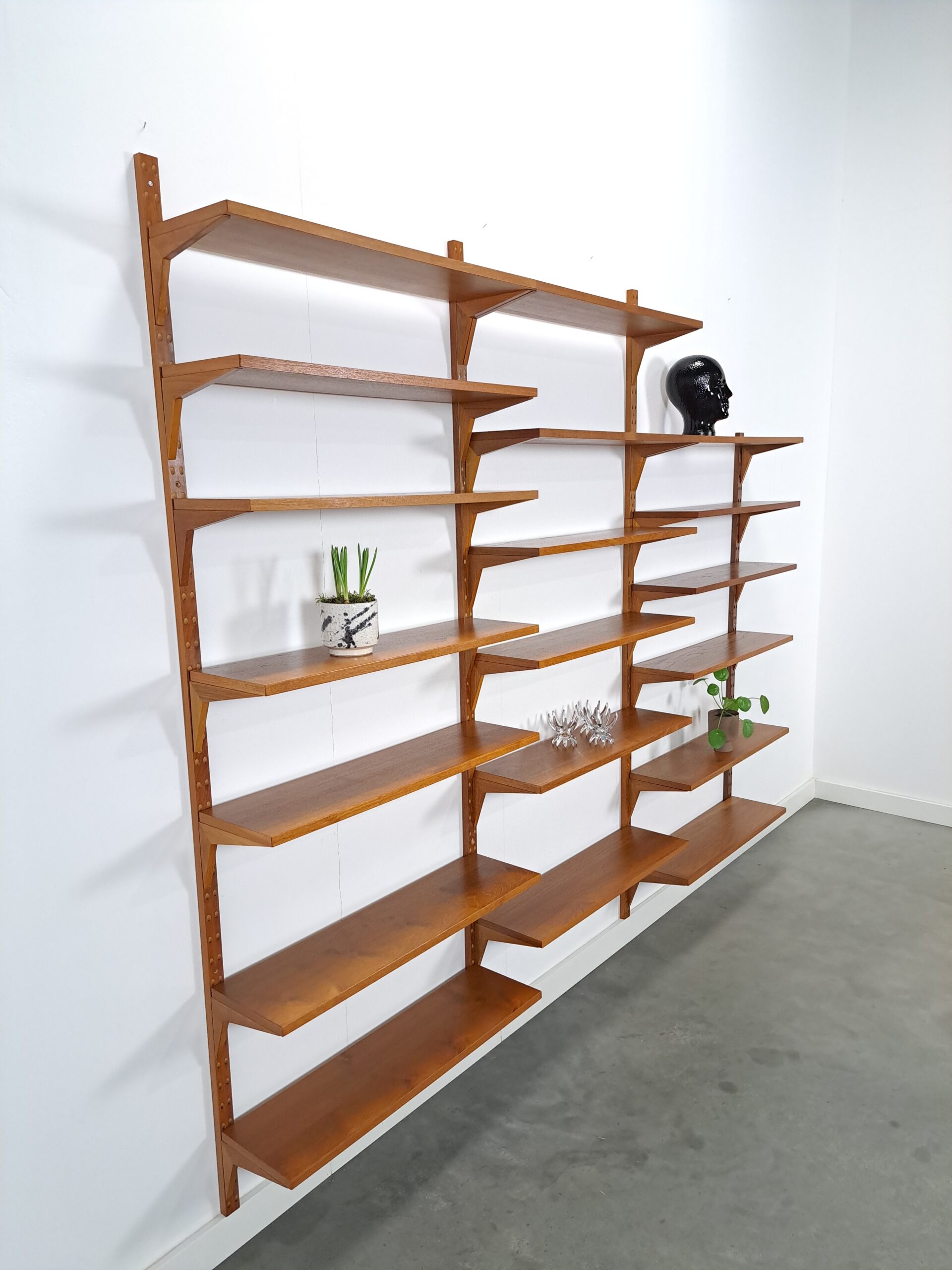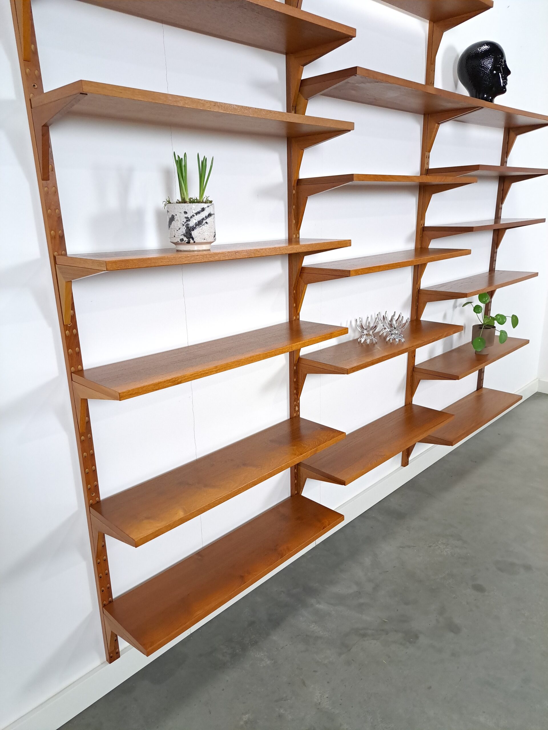 Teak modulair wandsysteem van het Deense merk Cadovius. Het Poul Cadovius Royal System is een teak wandsysteem dat een combinatie is van tijdloos design en functionaliteit. De mooi vormgegeven teakhouten en teakfineer onderdelen en het flexibele ophangsysteem maken het ideaal voor het opbergen van boeken, LP’s en accessoires. Het modulaire teak systeem is geheel naar wens in te delen en is demontabel.