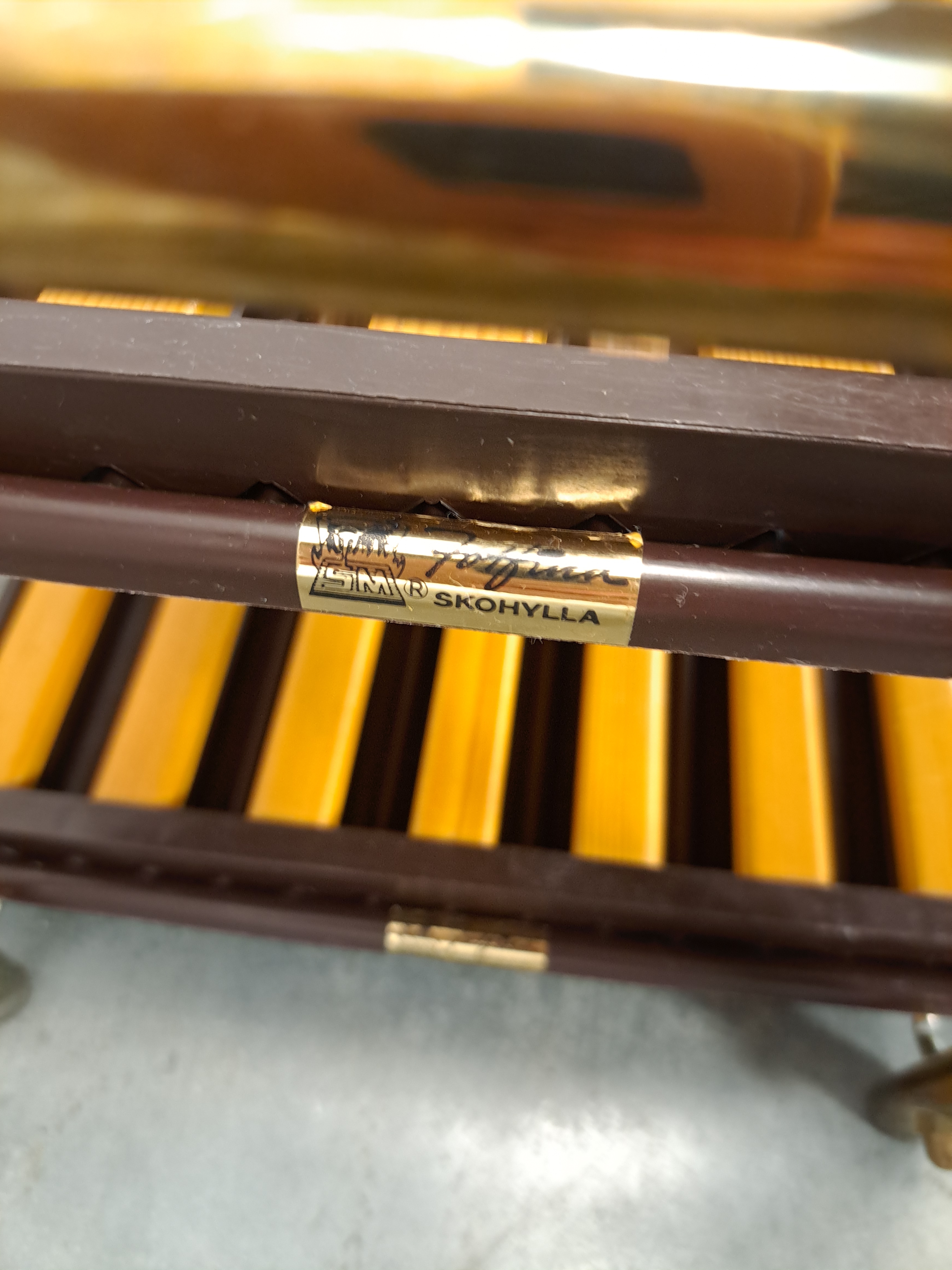 Vintage schoenenrek. Het schoenenrek komt uit Zweden en is ideaal voor het netjes wegzetten van de schoenen. Het rek heeft een metalen frame, een bruin kunststoffen inleg en houten houders. De bruine kunststof bladen kunnen eenvoudig verwijderd worden om ze schoon te maken.