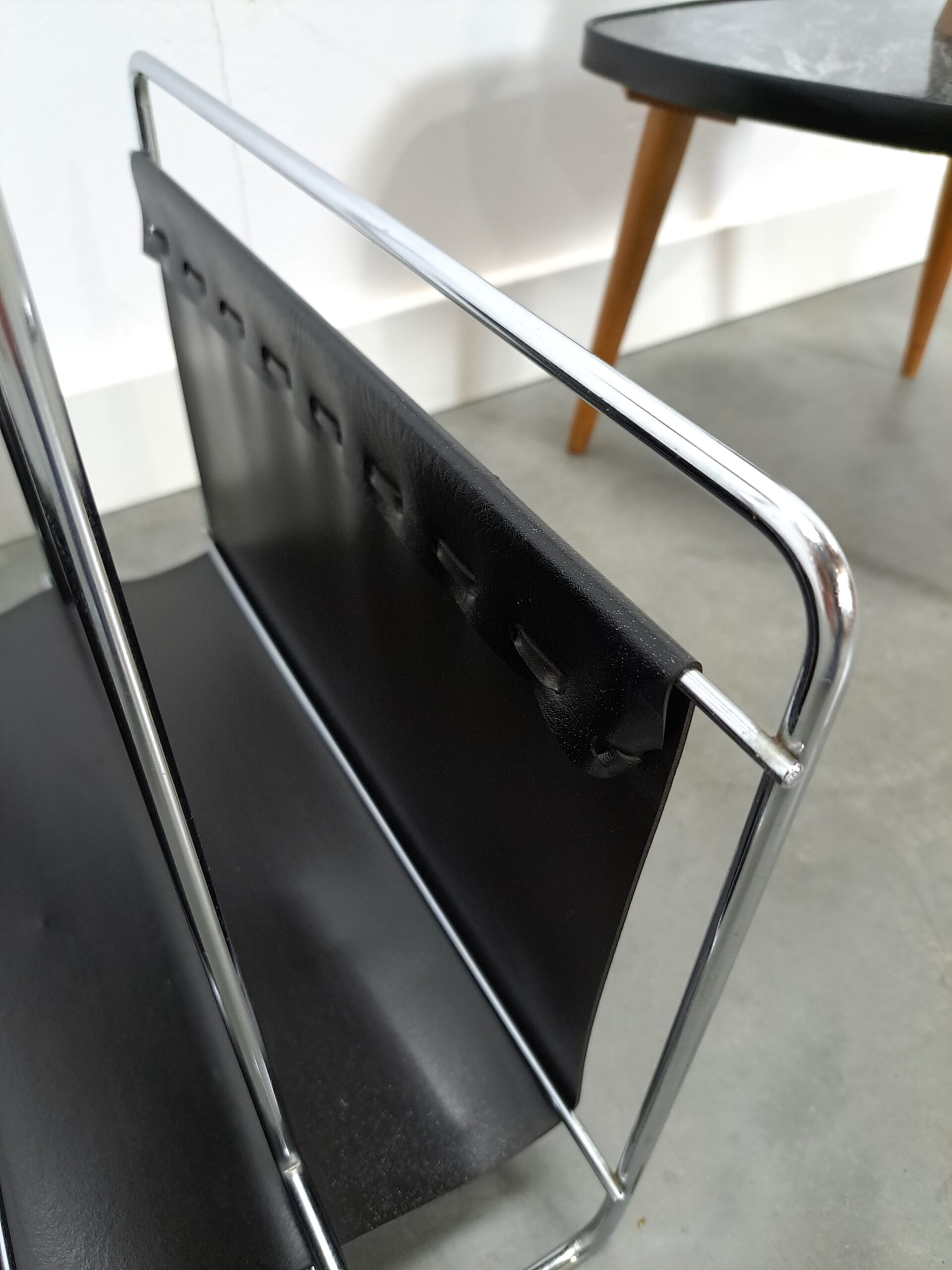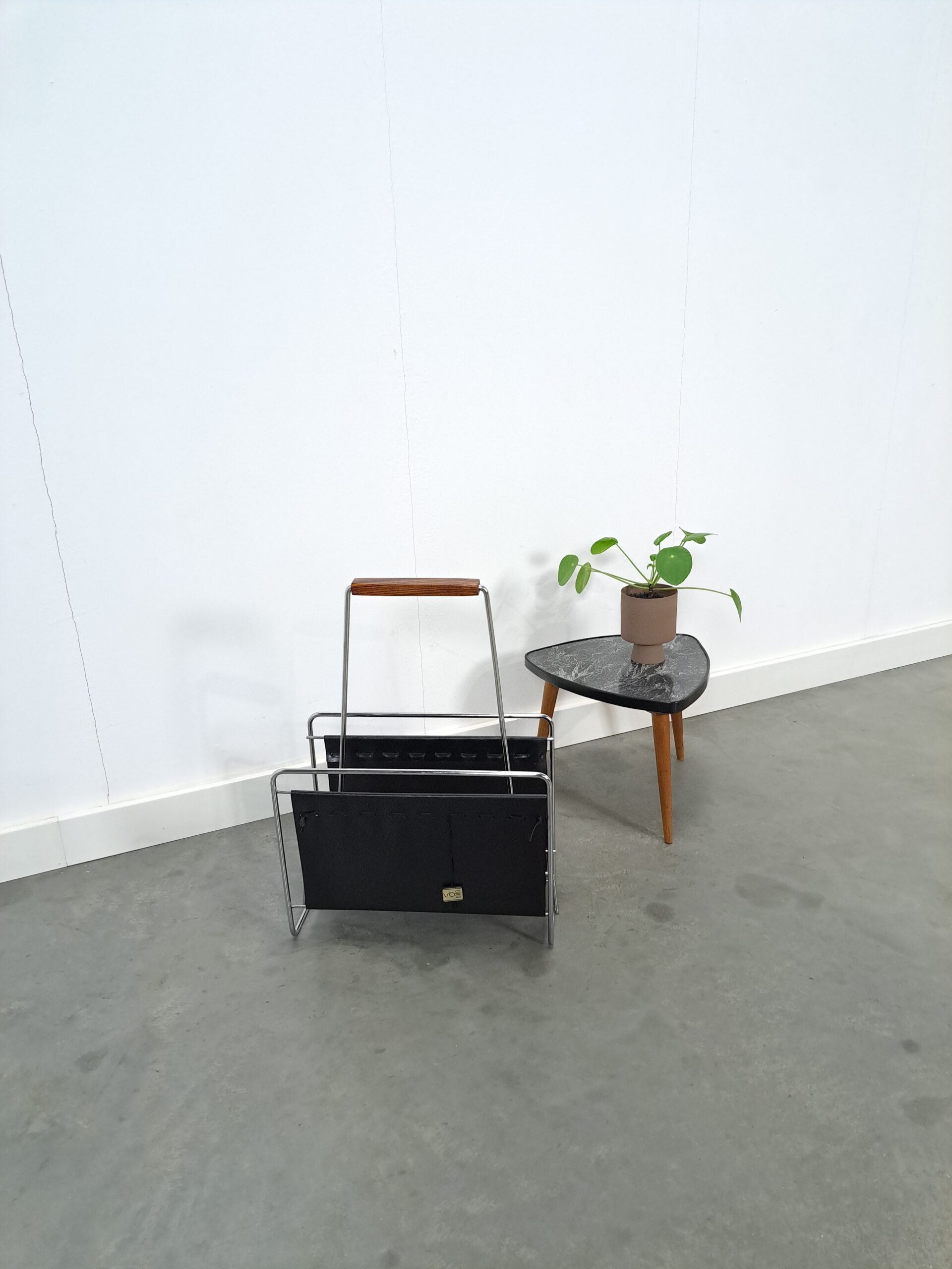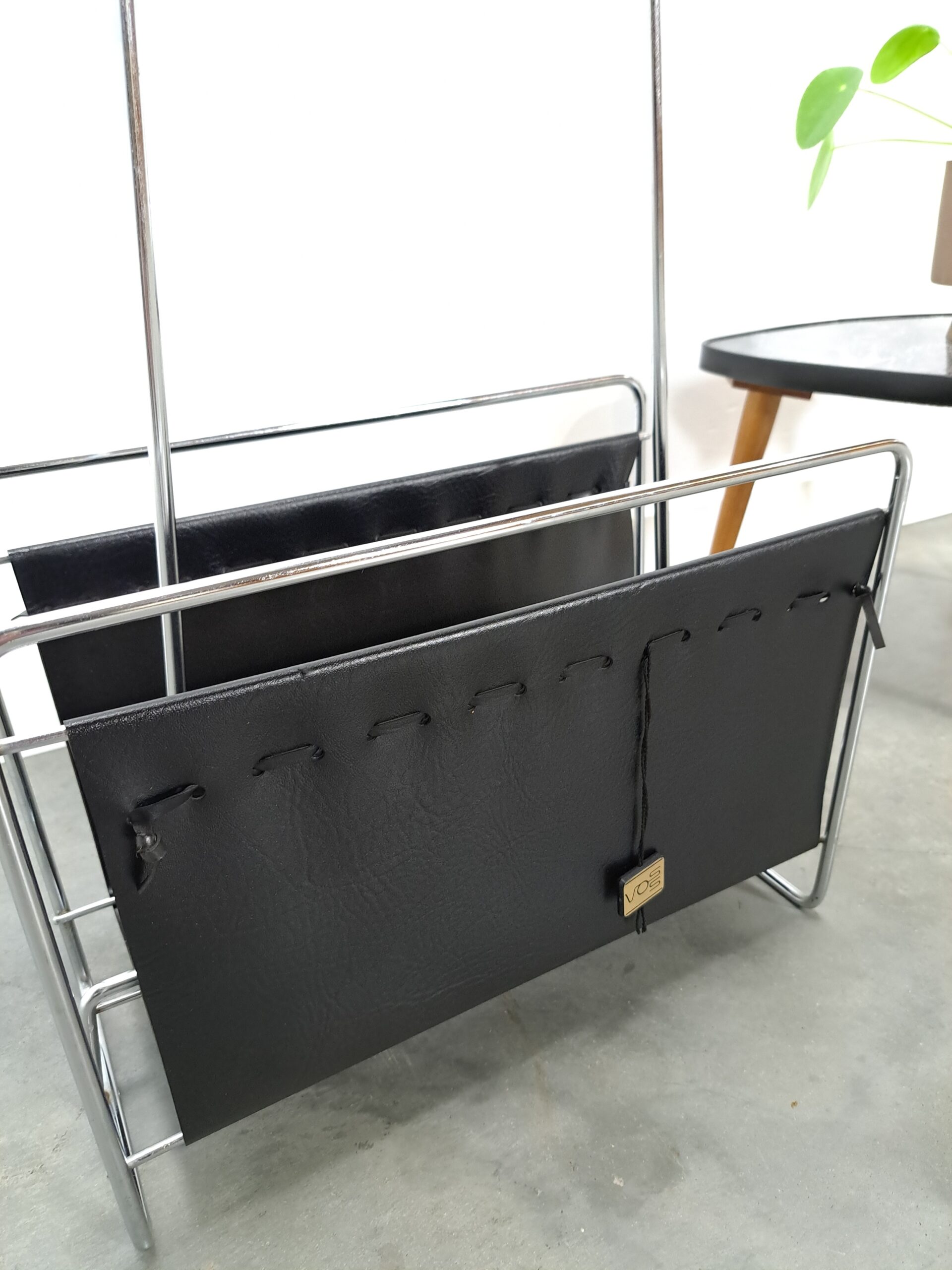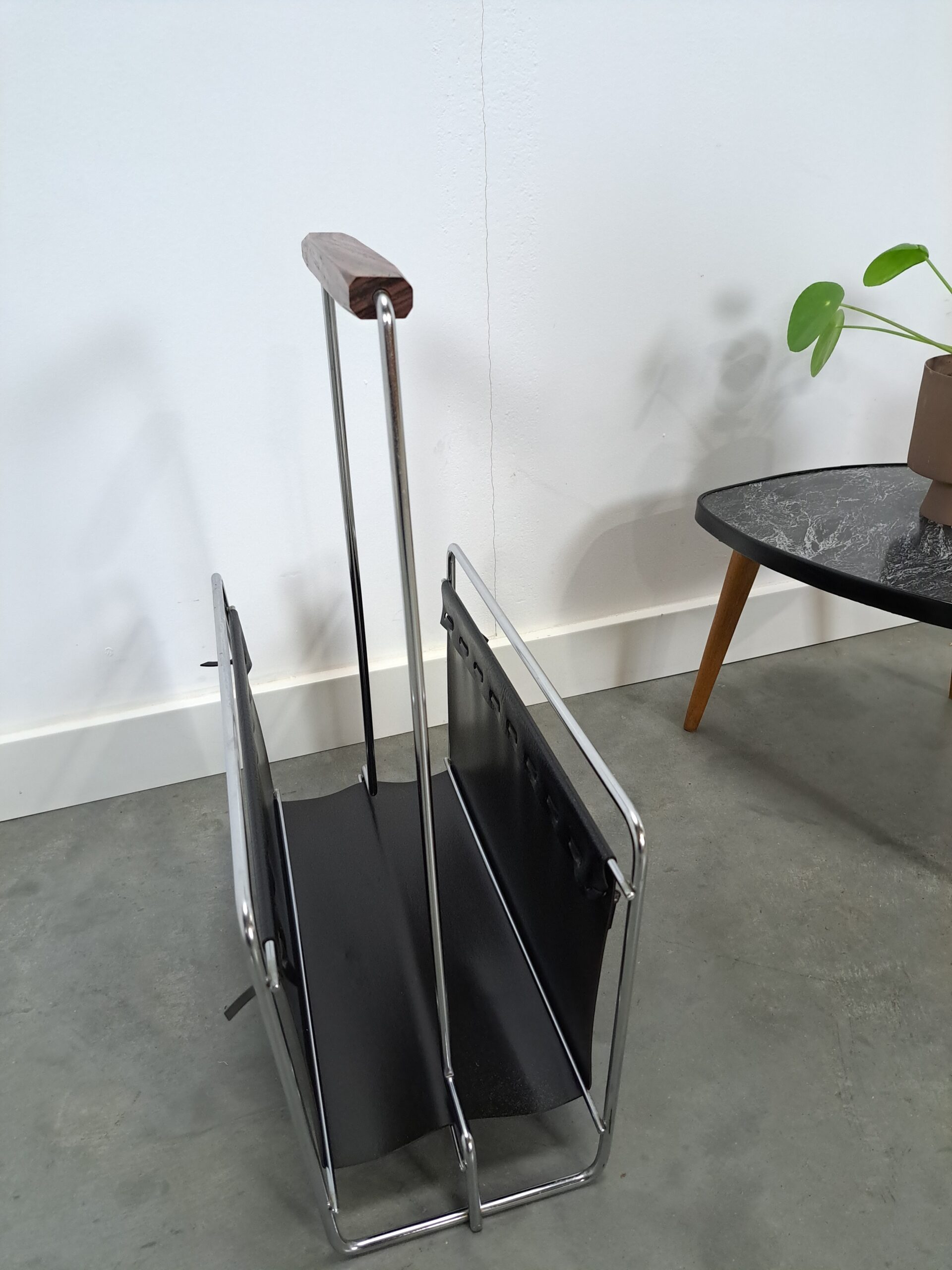 Vintage jaren 70 tijdschriftenrek van Voss. Het tijdschriftenrek heeft een mooie combinatie van zwart leer, chromen frame en teakhouten handgreep. Een stijlvol, minimalistisch designstuk dat je magazines elegant presenteert.