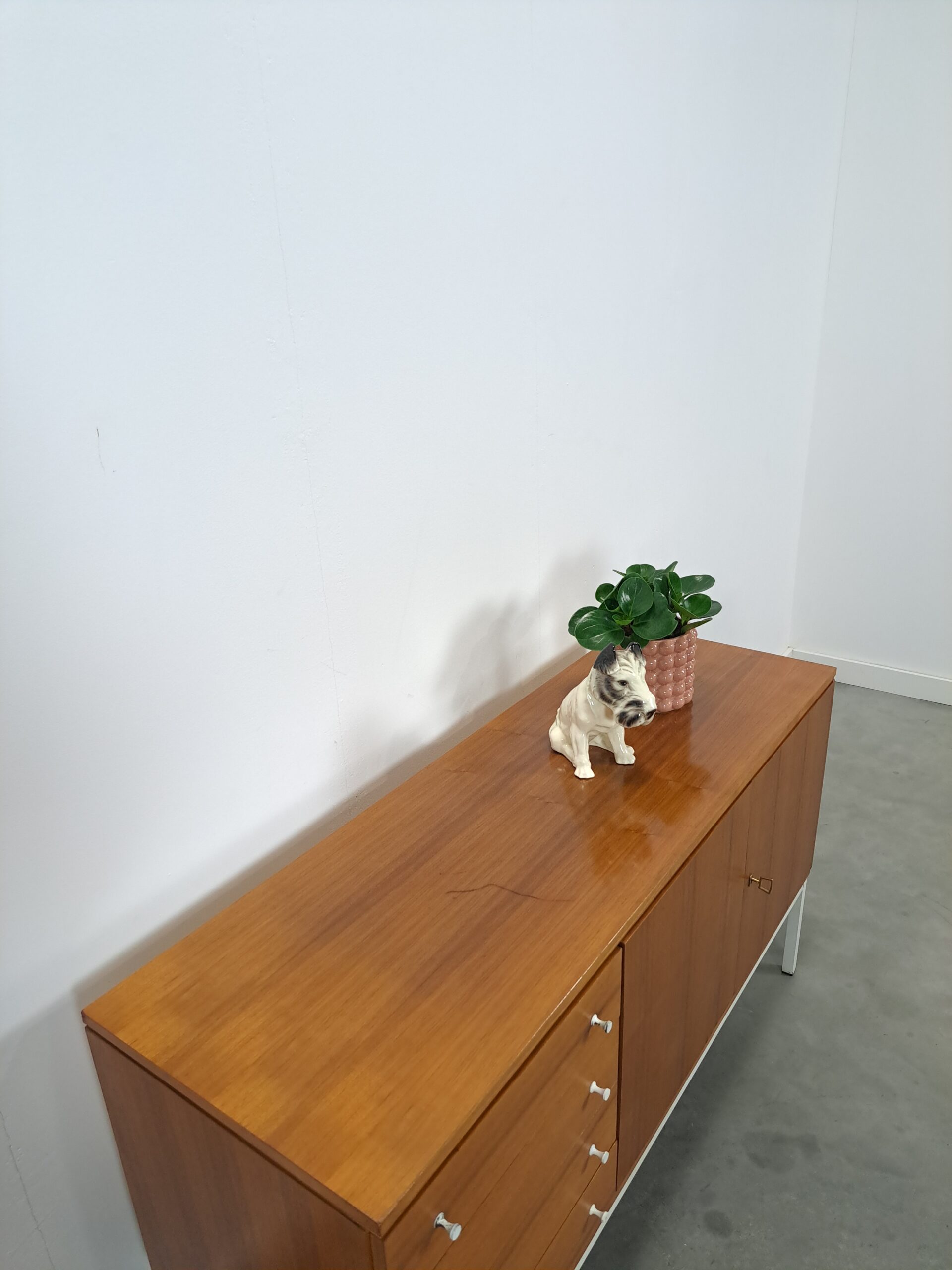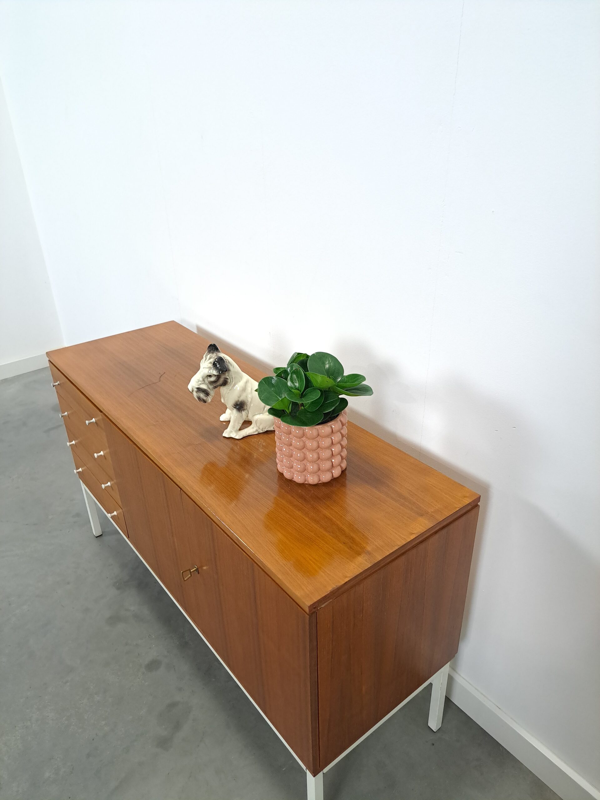 Vintage teak fineer dressoir. De kast komt uit Zweden en heeft een leuke mix van teak fineer en metaal. Het wit metalen onderstel en witte grepen zorgen voor een frisse uitstraling.