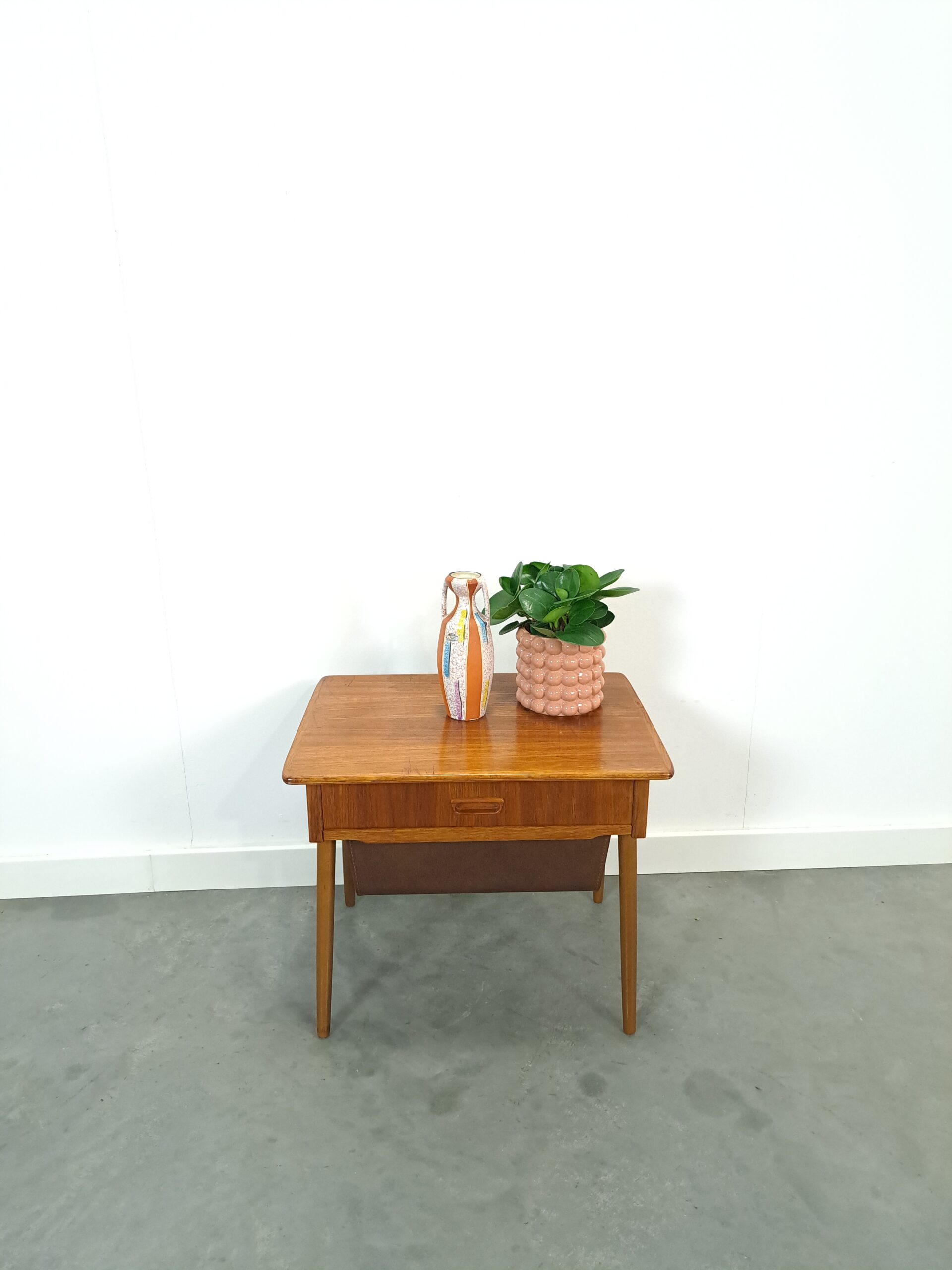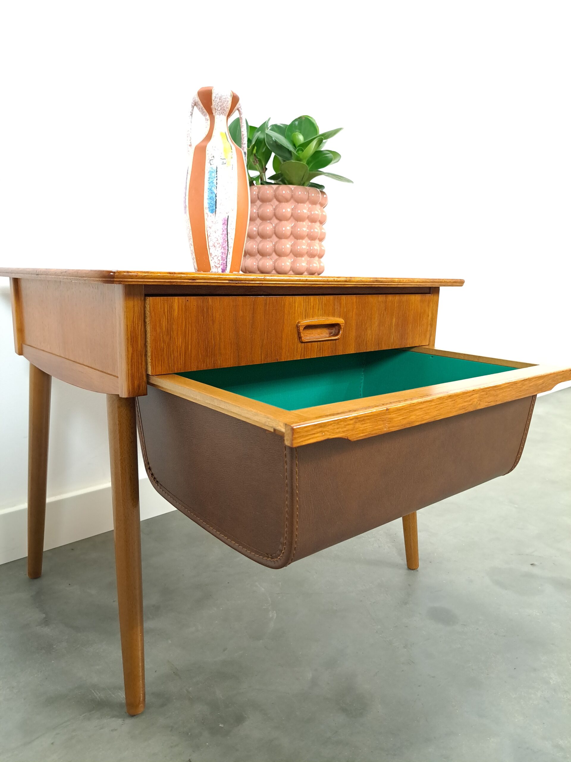 Vintage naaikastje. Het kastje komt uit Zweden en werd gebruikt om al het naaigaren in op te bergen. Het kastje heeft twee lades, waarvan één diepe bruine kunstlederen lade.