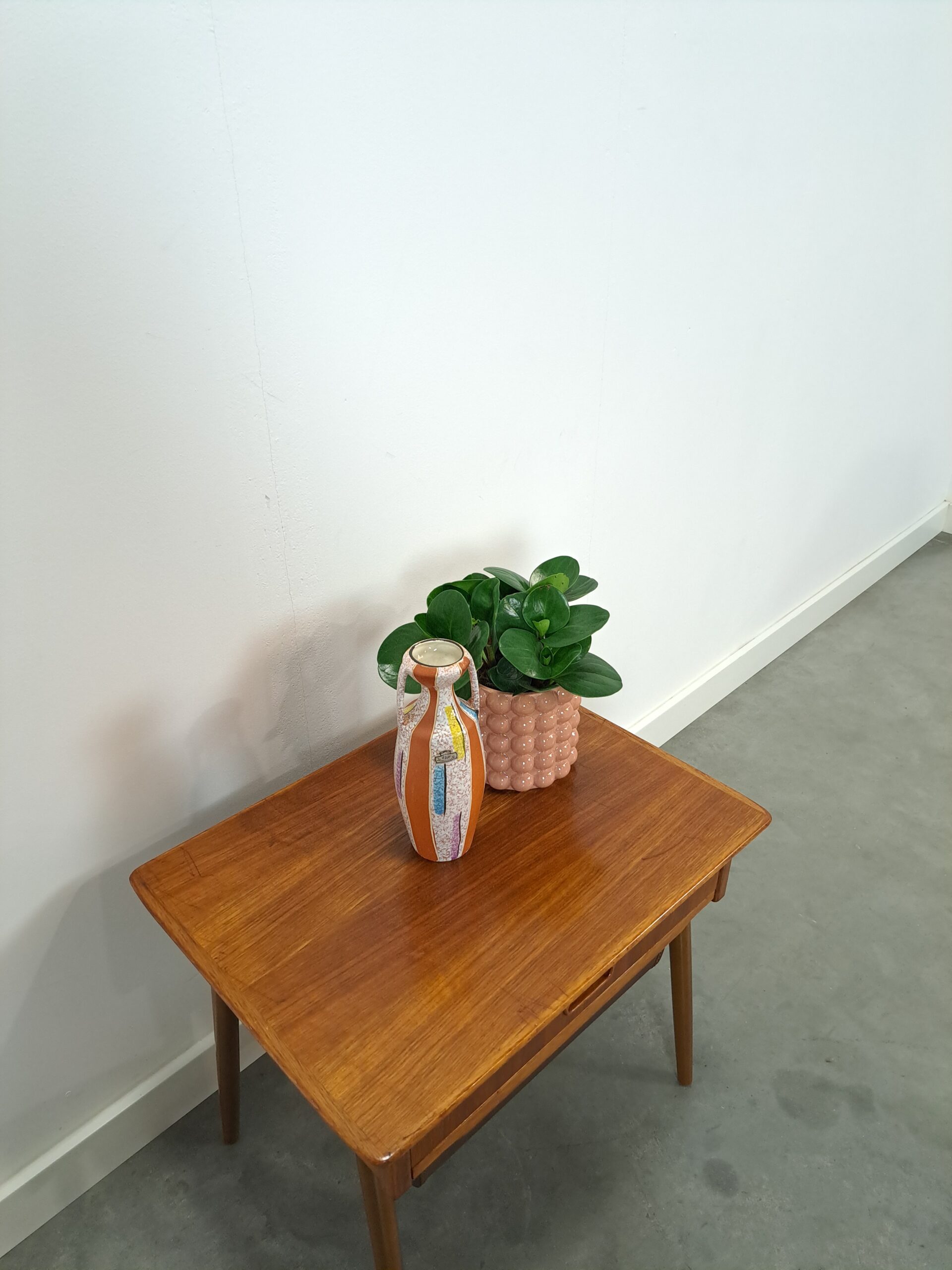 Het naai tafeltje is in een goede conditie, met gebruikssporen, passend bij de vintage leeftijd. Op het blad zitten krassen.