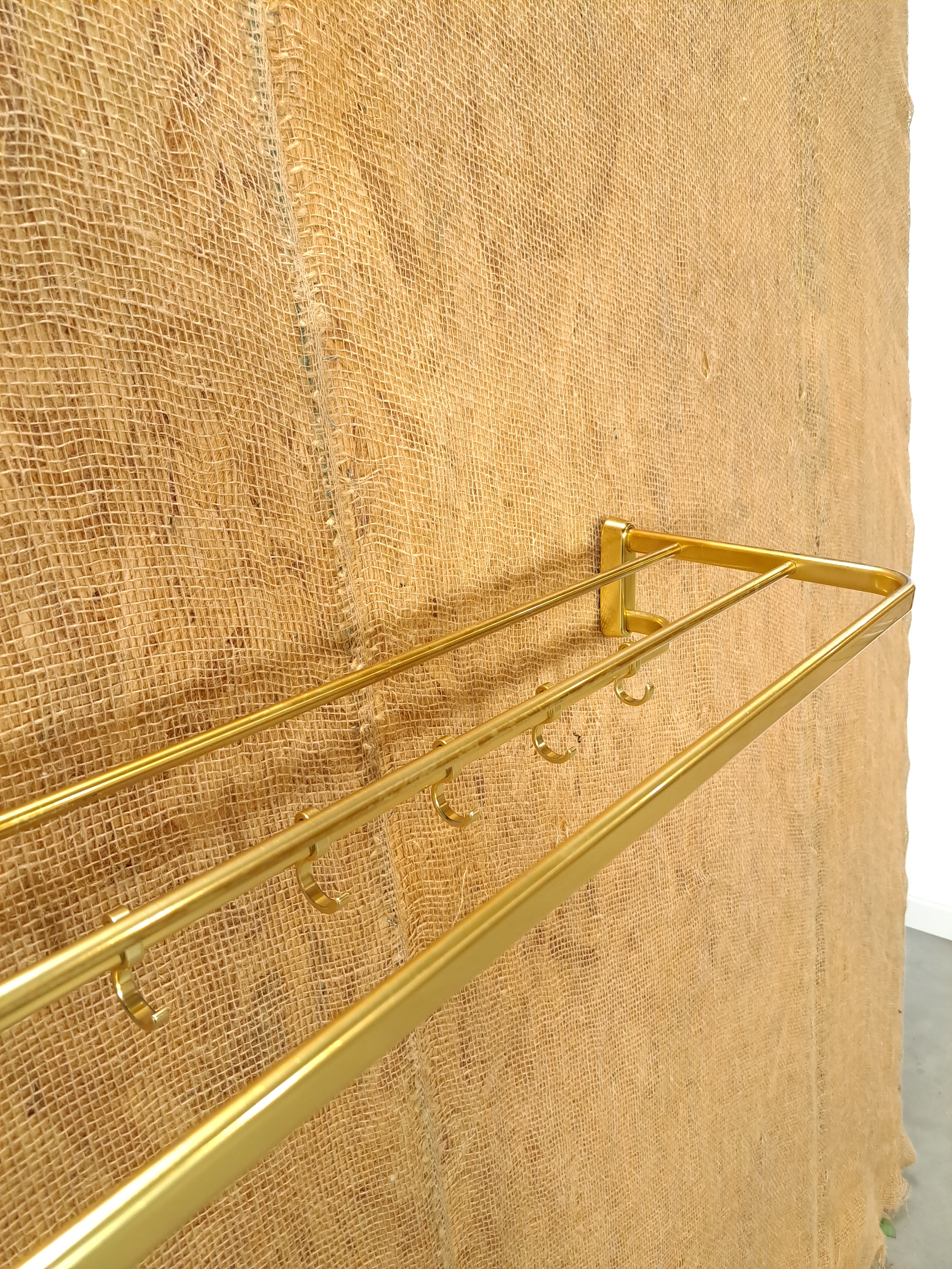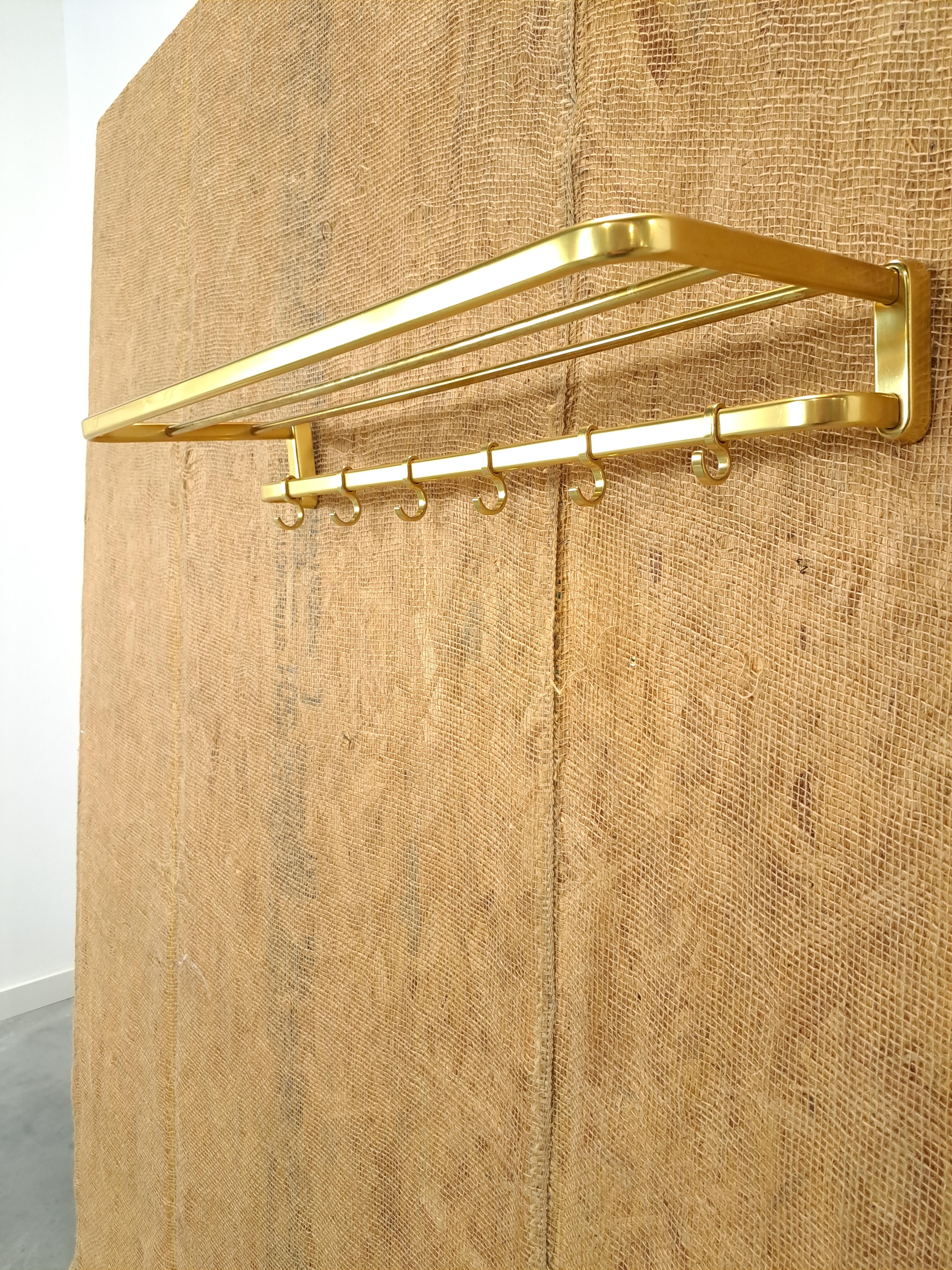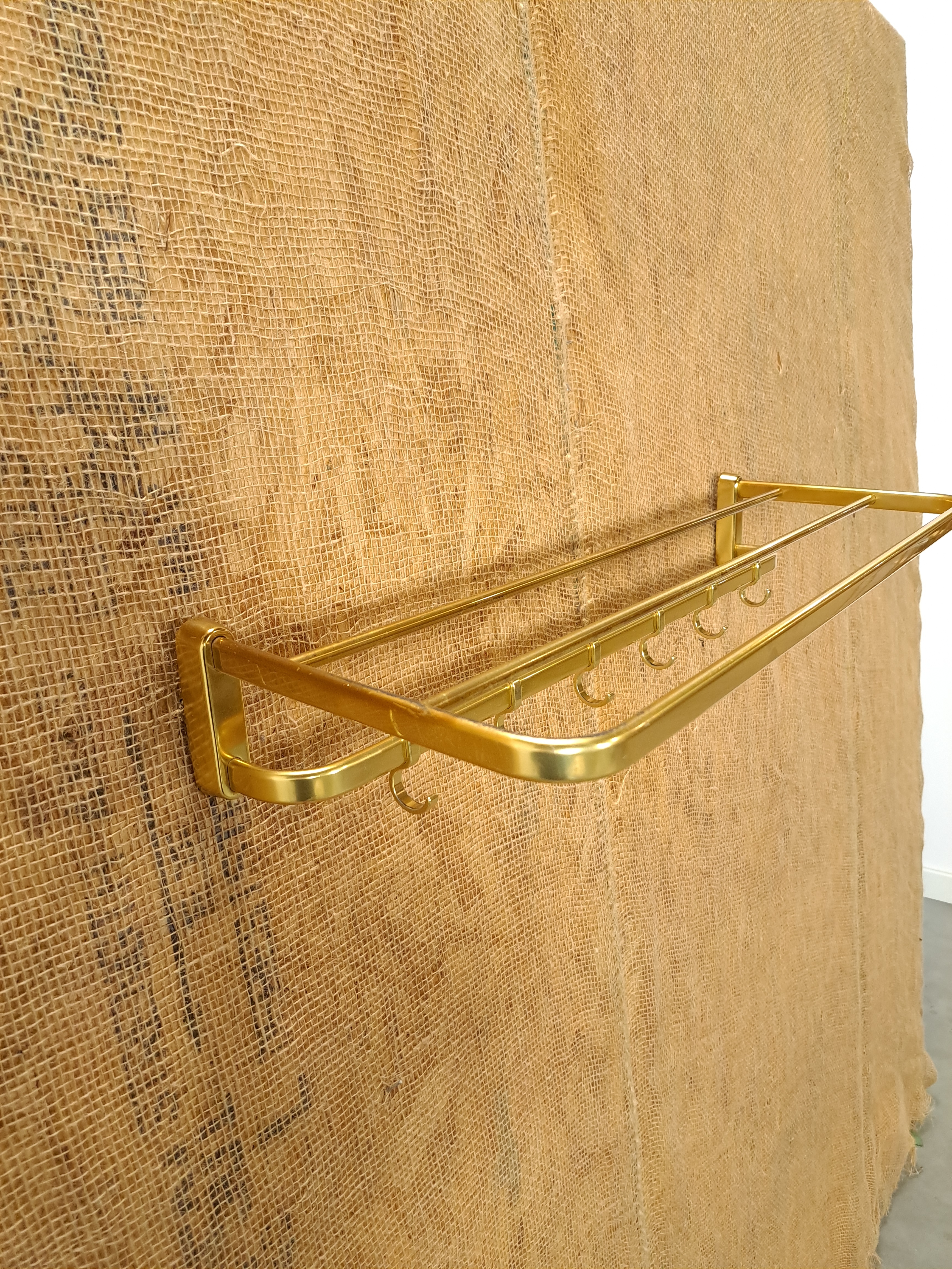Vintage wandkapstok. De goudkleurige kapstok komt uit Zweden rond 1960. De kapstok heeft handige haken voor het ophangen van een jas en een legplank.