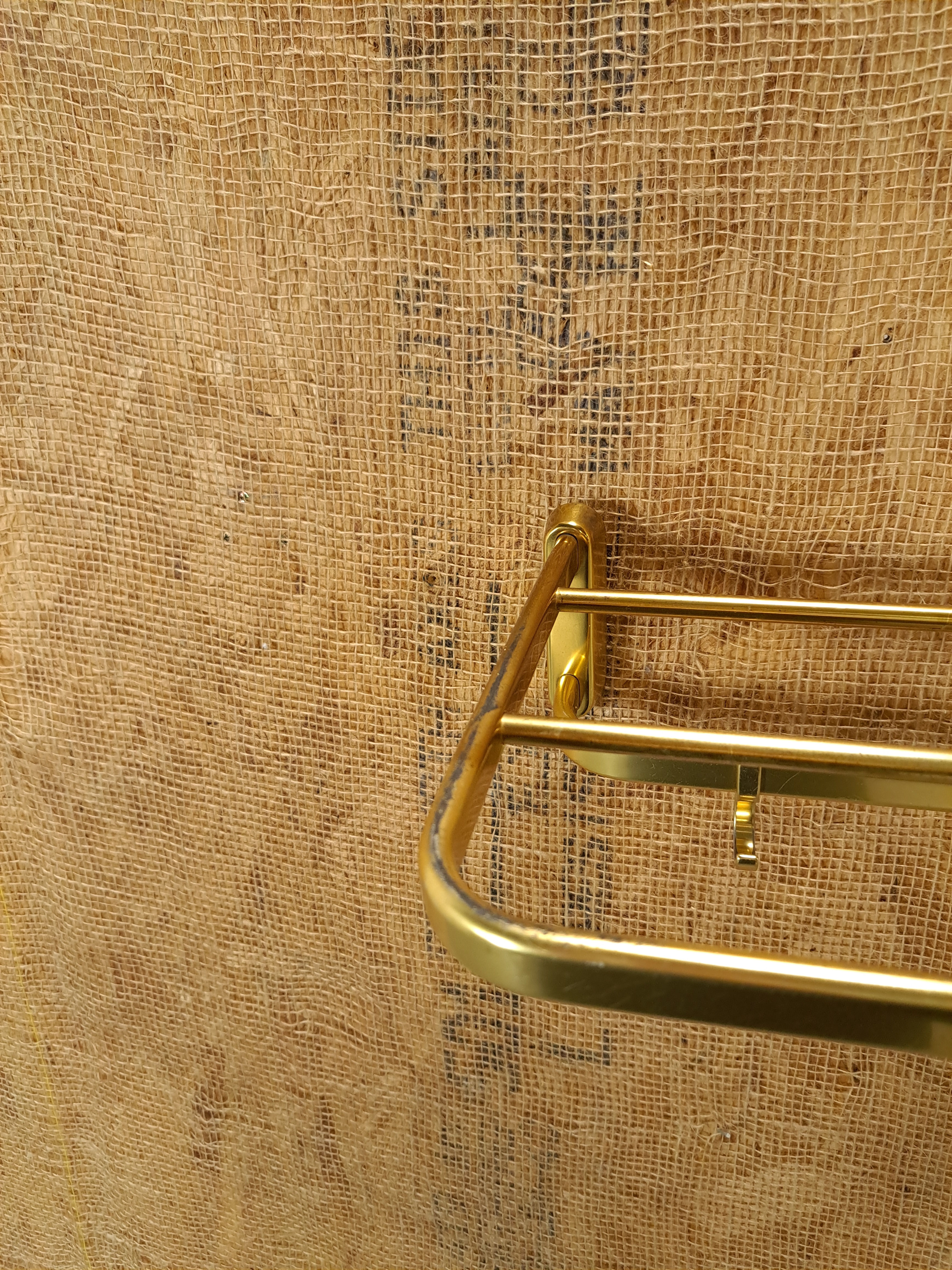 De wandkapstok is in een goede conditie, met duidelijke gebruikssporen, passend bij de vintage leeftijd. De goudkleurige toplaag is op enkele plekken iets beschadigd door krassen.
