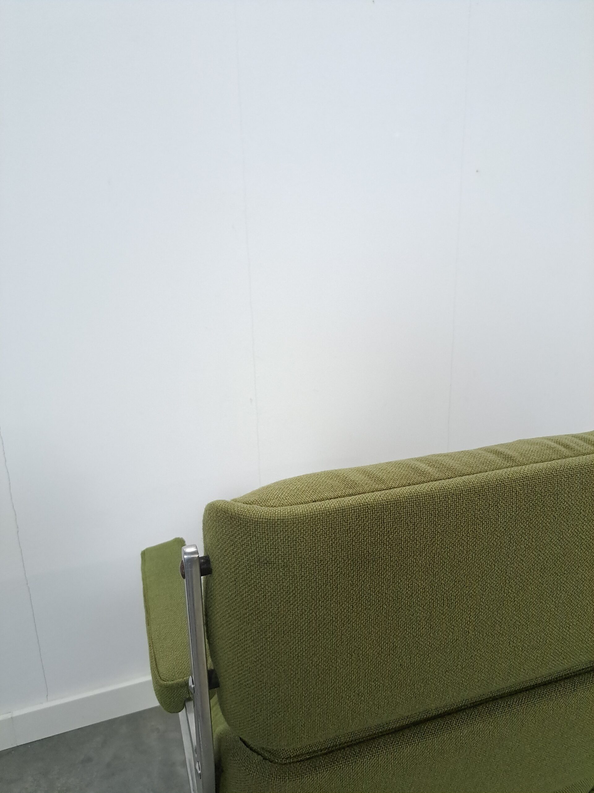 Stijlvolle vintage bureaustoel. De draaibare stoel komt uit Noorwegen en is uitgegeven door Ring Mekanikk. De bureaustoel heeft groene stoffen bekleding, gecombineerd met een vijfster gepolijst aluminium voet en frame en roestvrijstalen wielen. De bureaustoel is in hoogte verstelbaar en de wielen draaien goed. De bekleding is professioneel gereinigd.