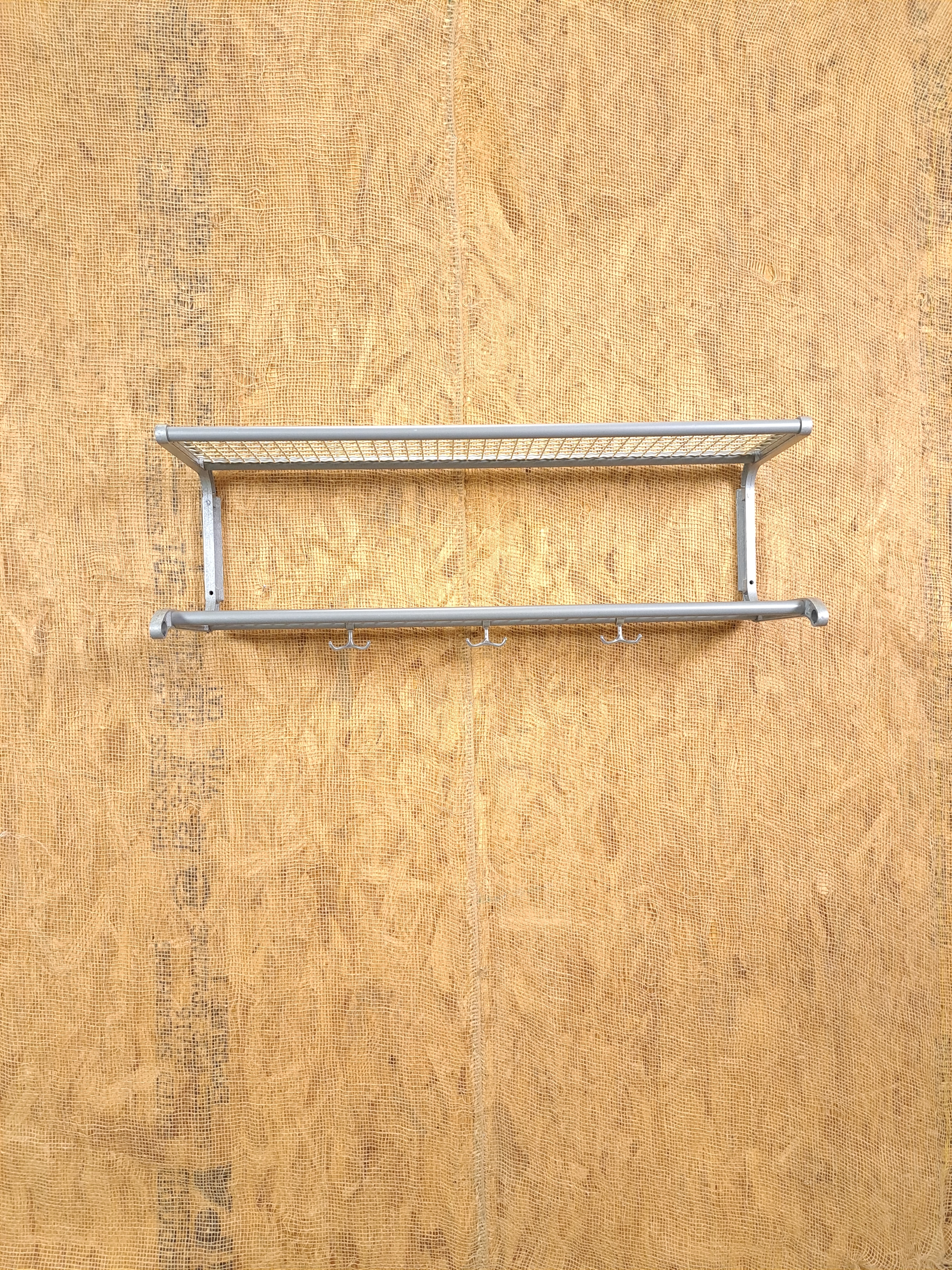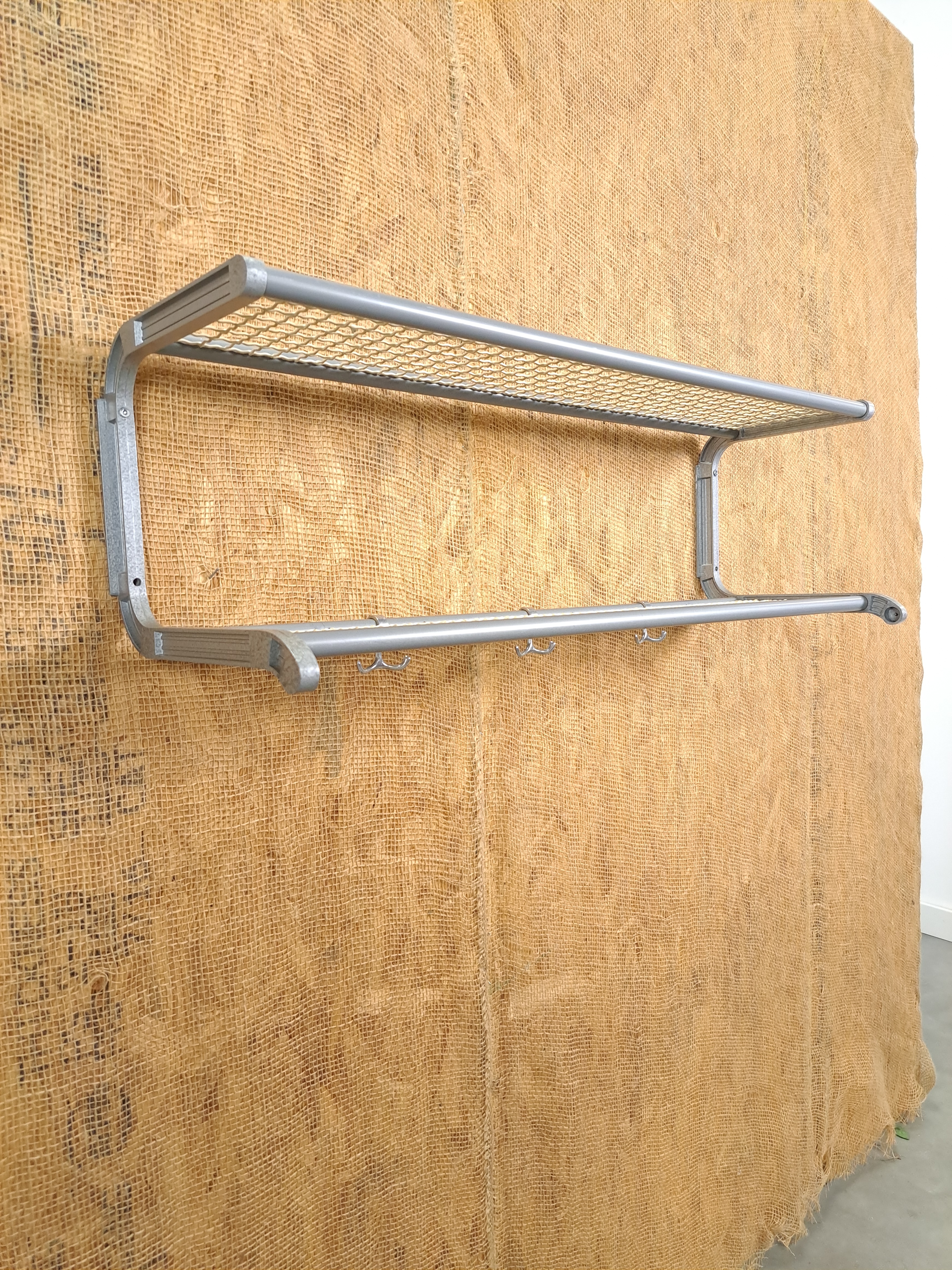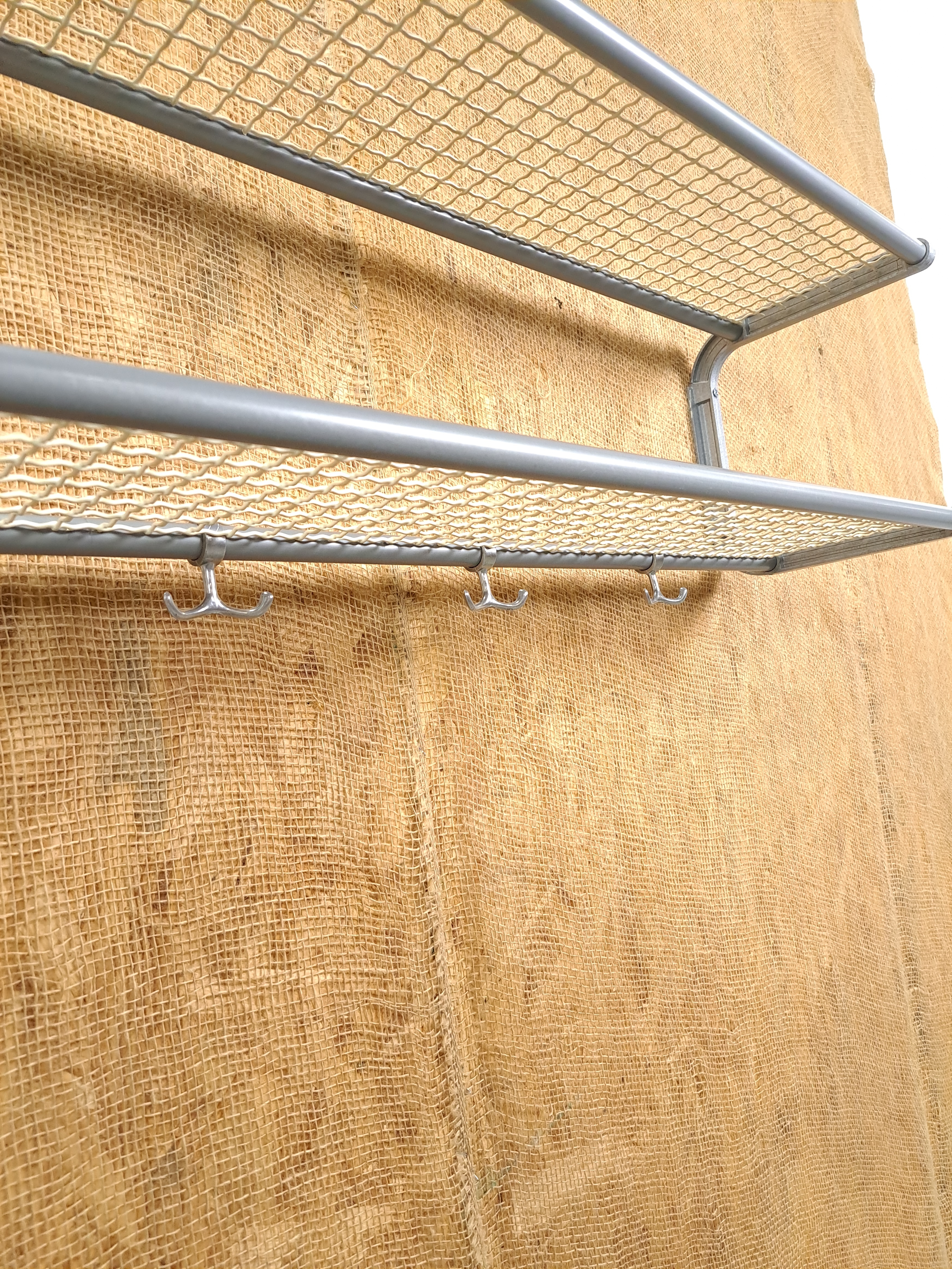 Vintage wandkapstok. De grijze kapstok komt uit Zweden en is uitgegeven door Habo rond 1960. De kapstok heeft handige haken en 2 legplanken van wit gaas.