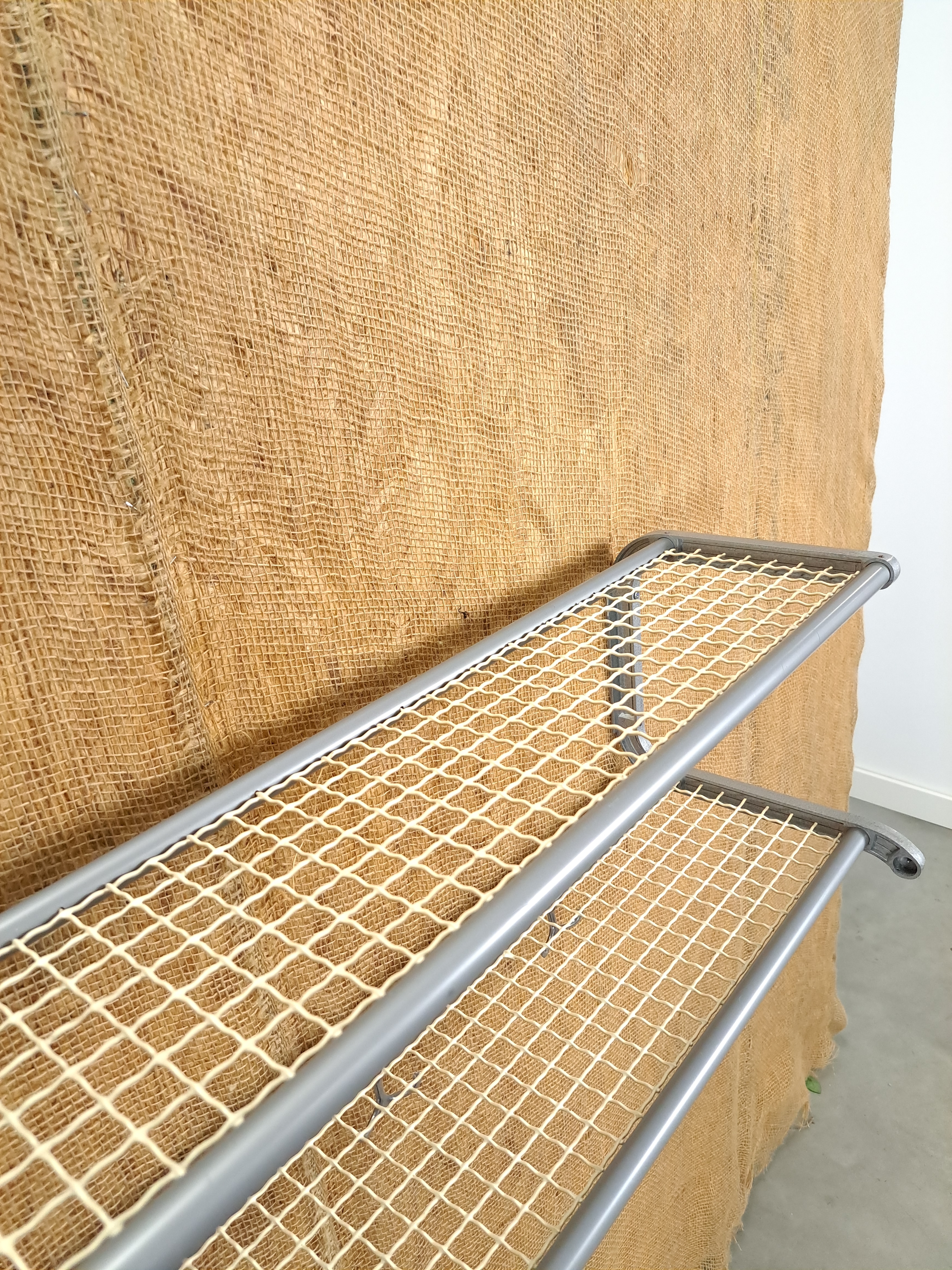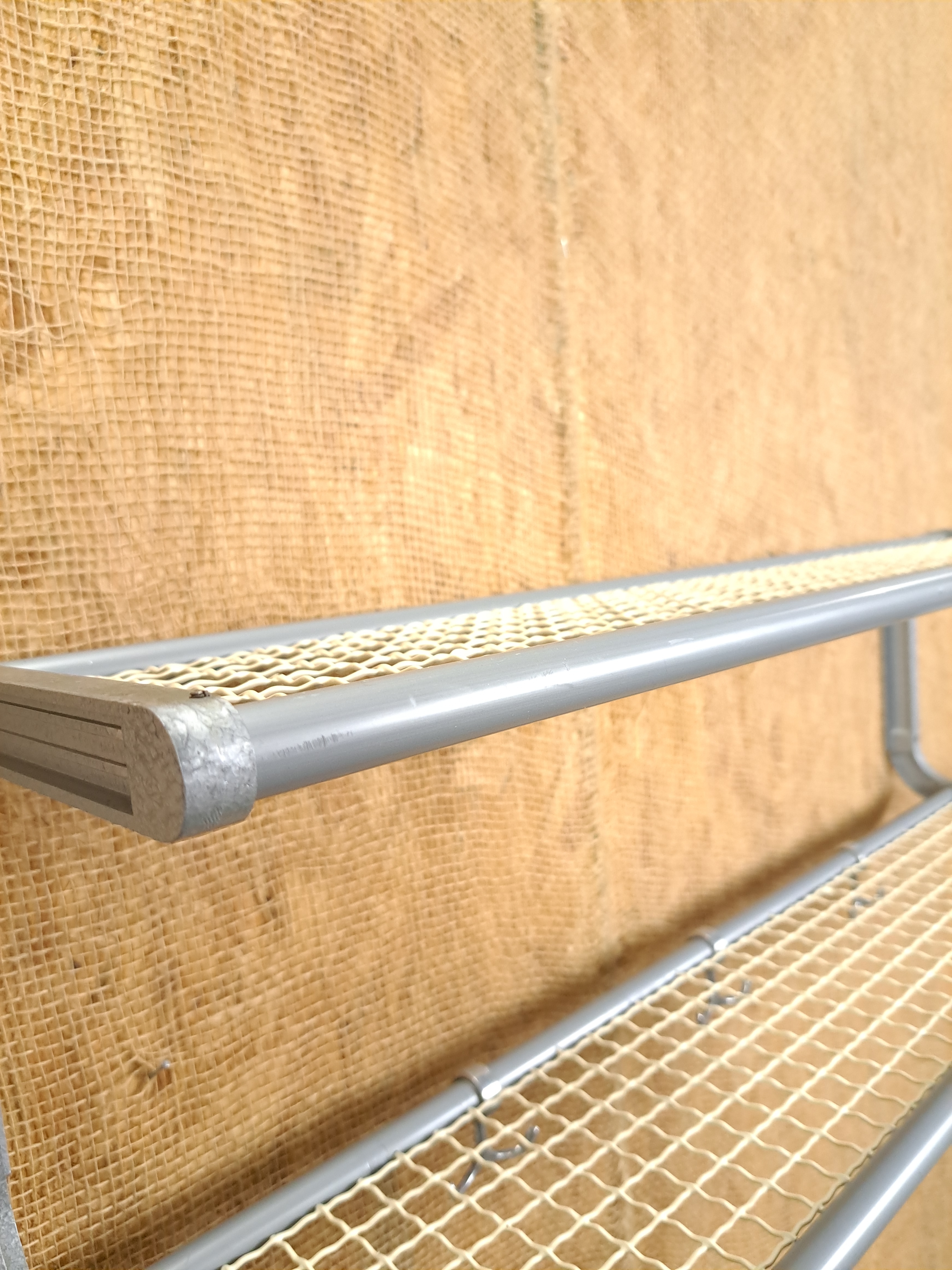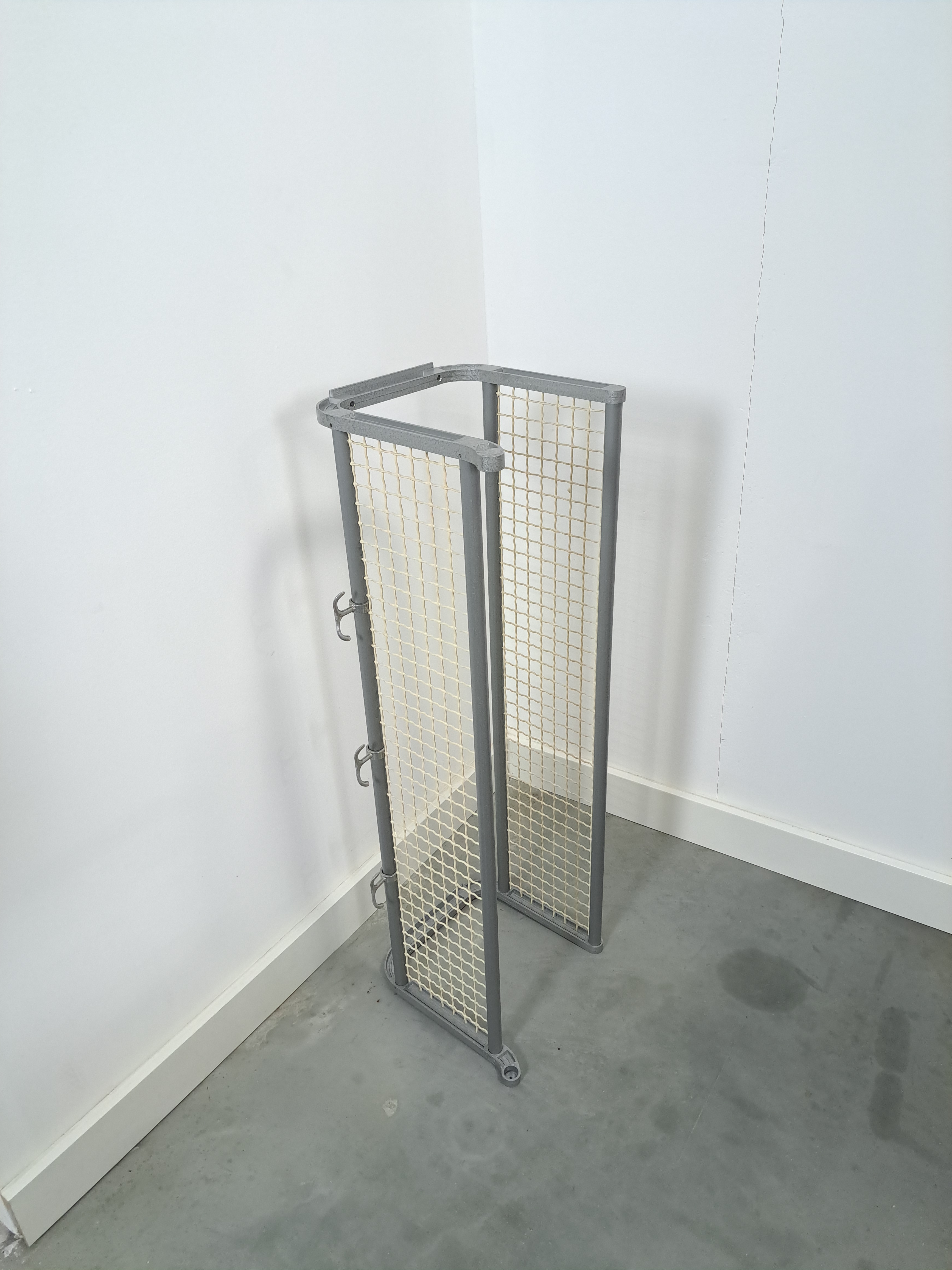 Vintage wandkapstok. De grijze kapstok komt uit Zweden en is uitgegeven door Habo rond 1960. De kapstok heeft handige haken en 2 legplanken van wit gaas.