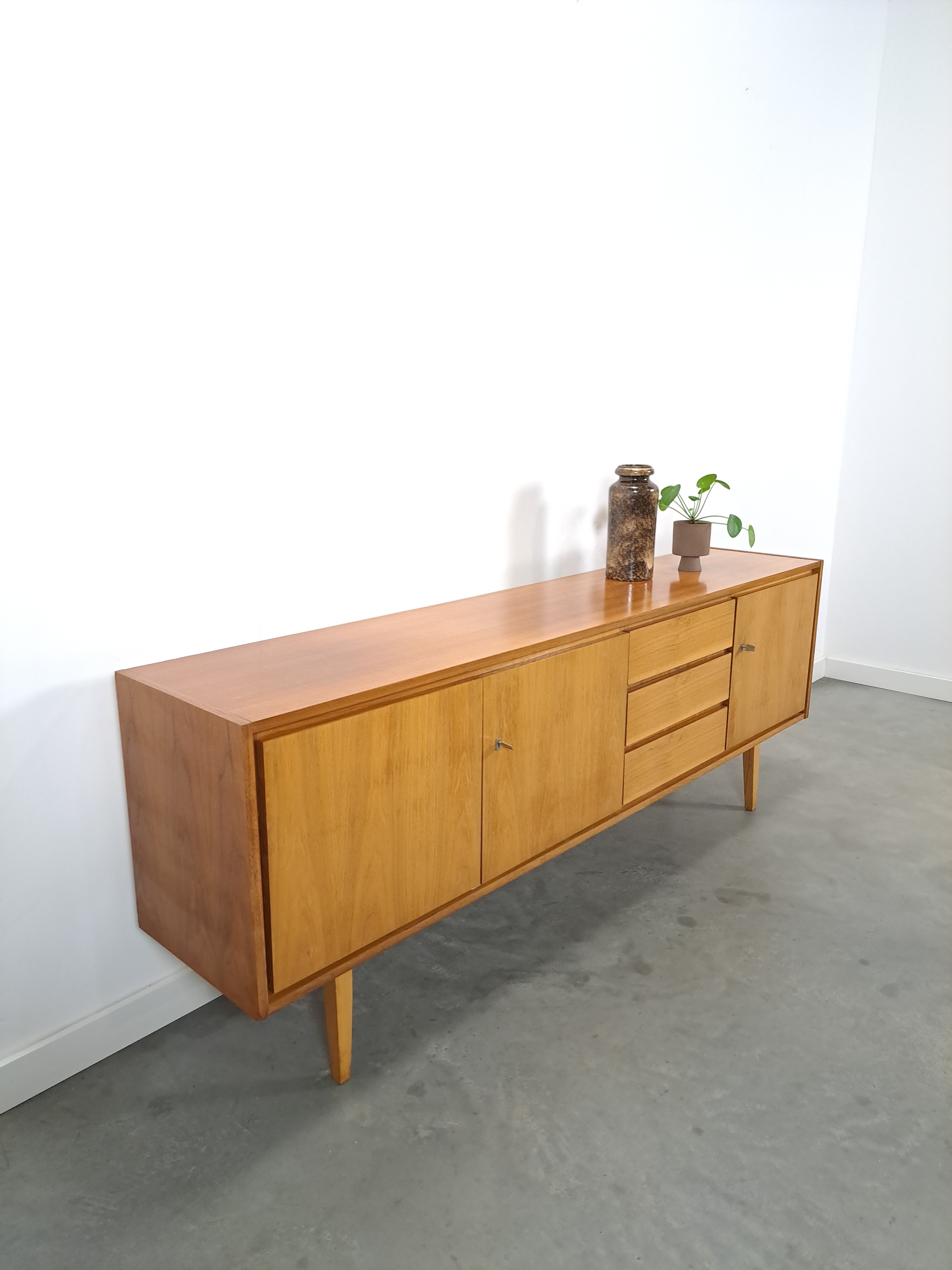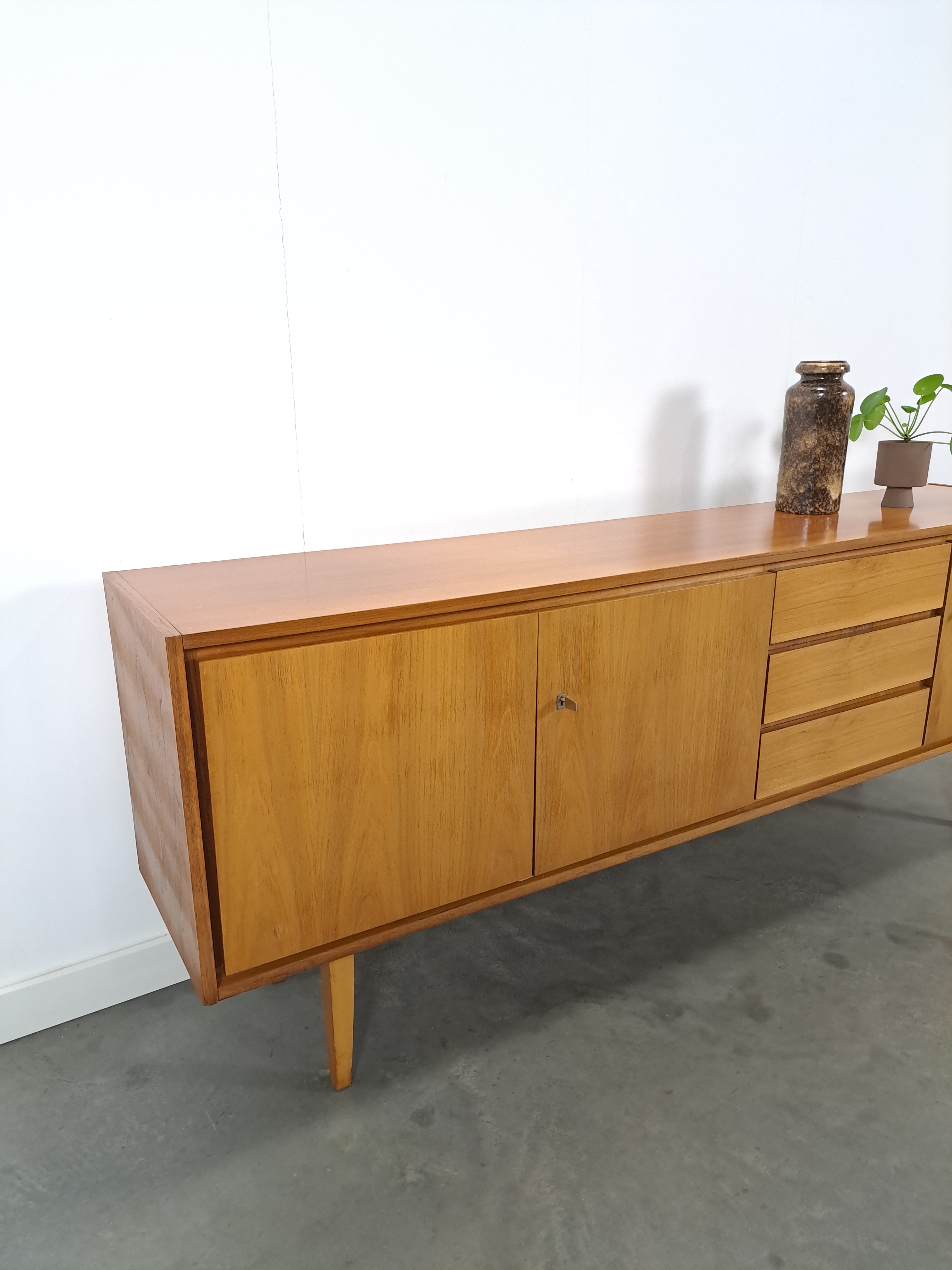 Vintage dressoir afkomstig uit Duitsland. Het mid- century dressoir heeft een fijn formaat en biedt daardoor veel opbergruimte. De kast heeft een mix van deuren met legplanken, 3 lades en is afgewerkt met een toplaag van kwaliteits notenfineer.