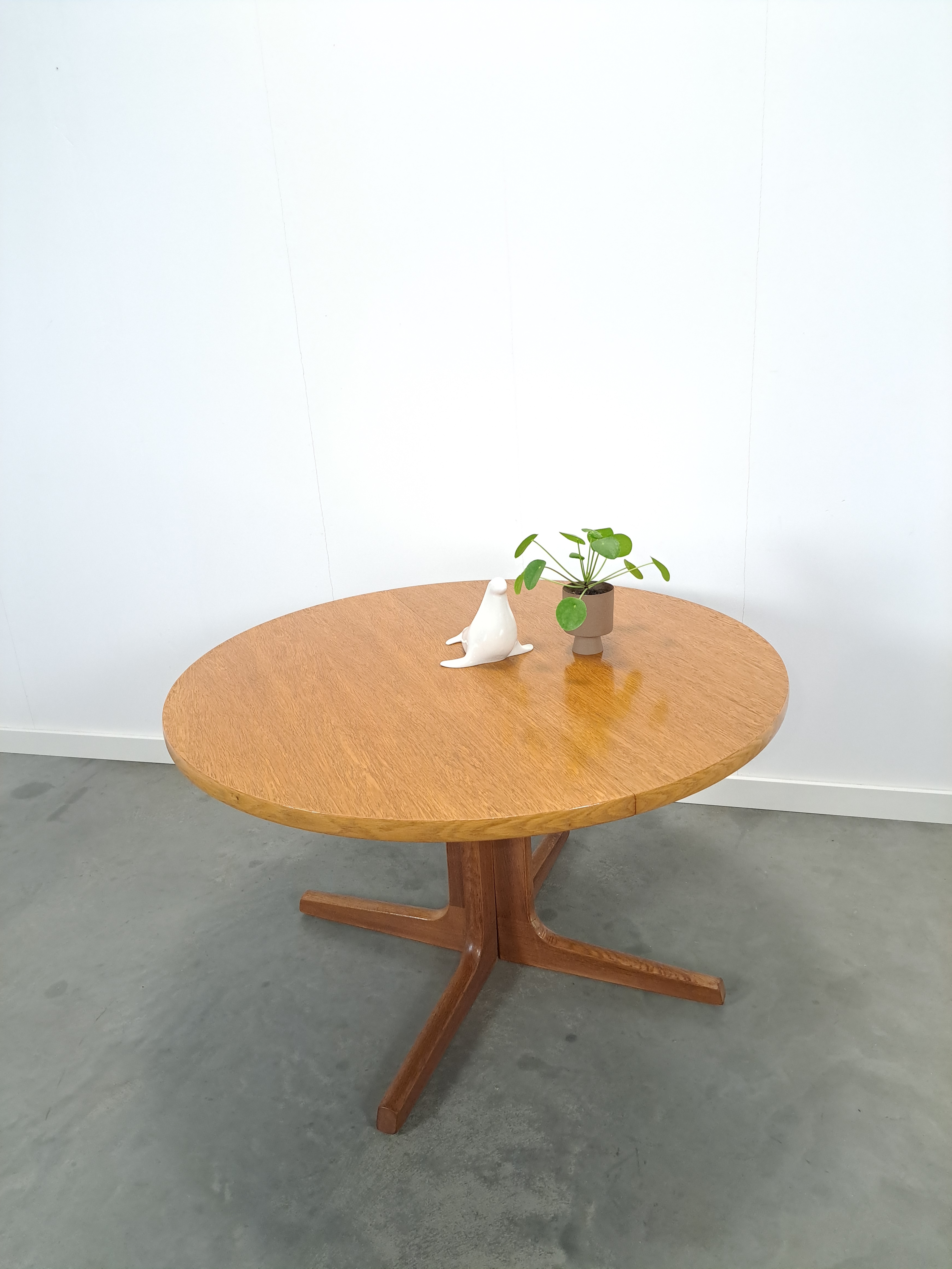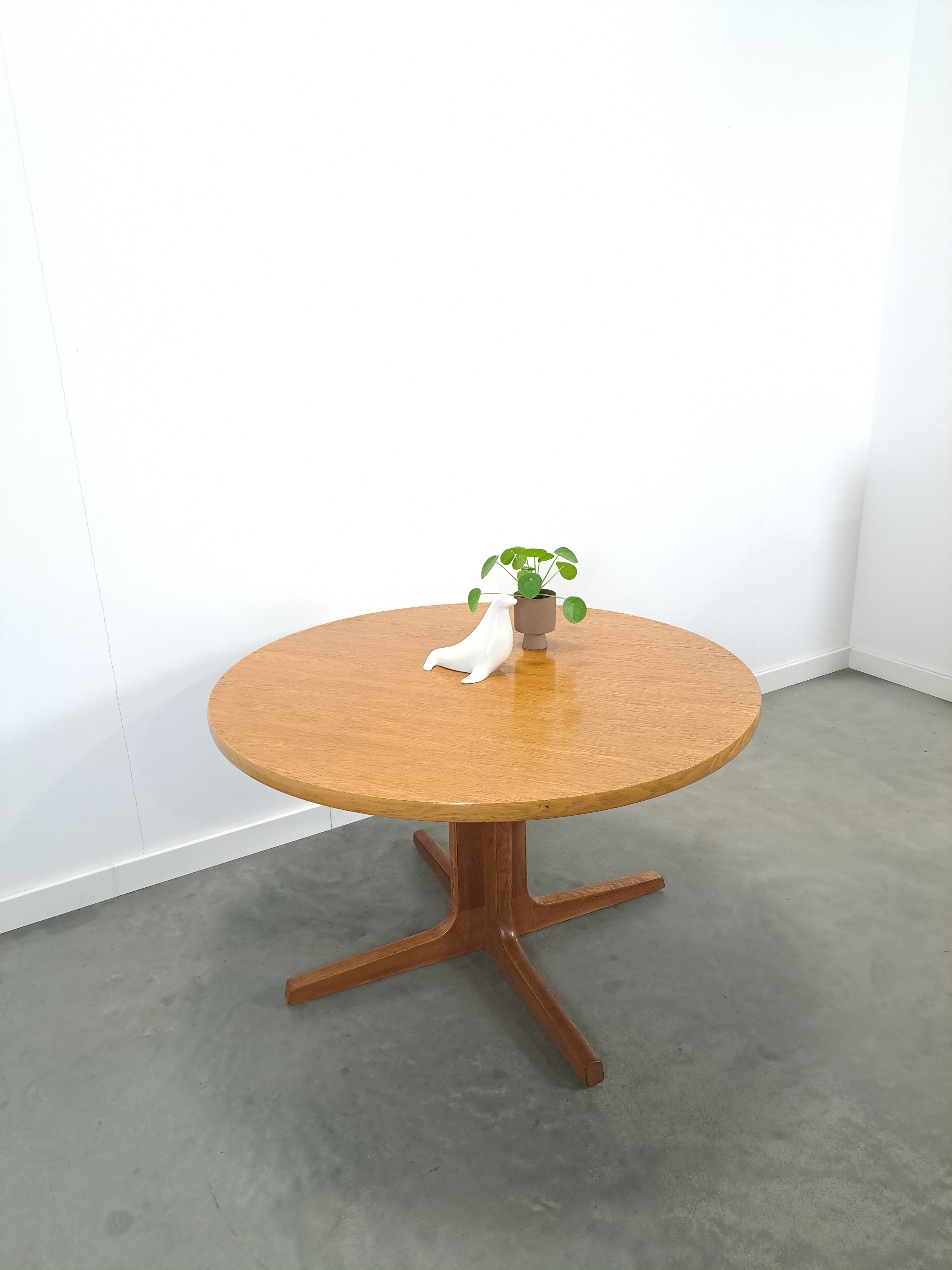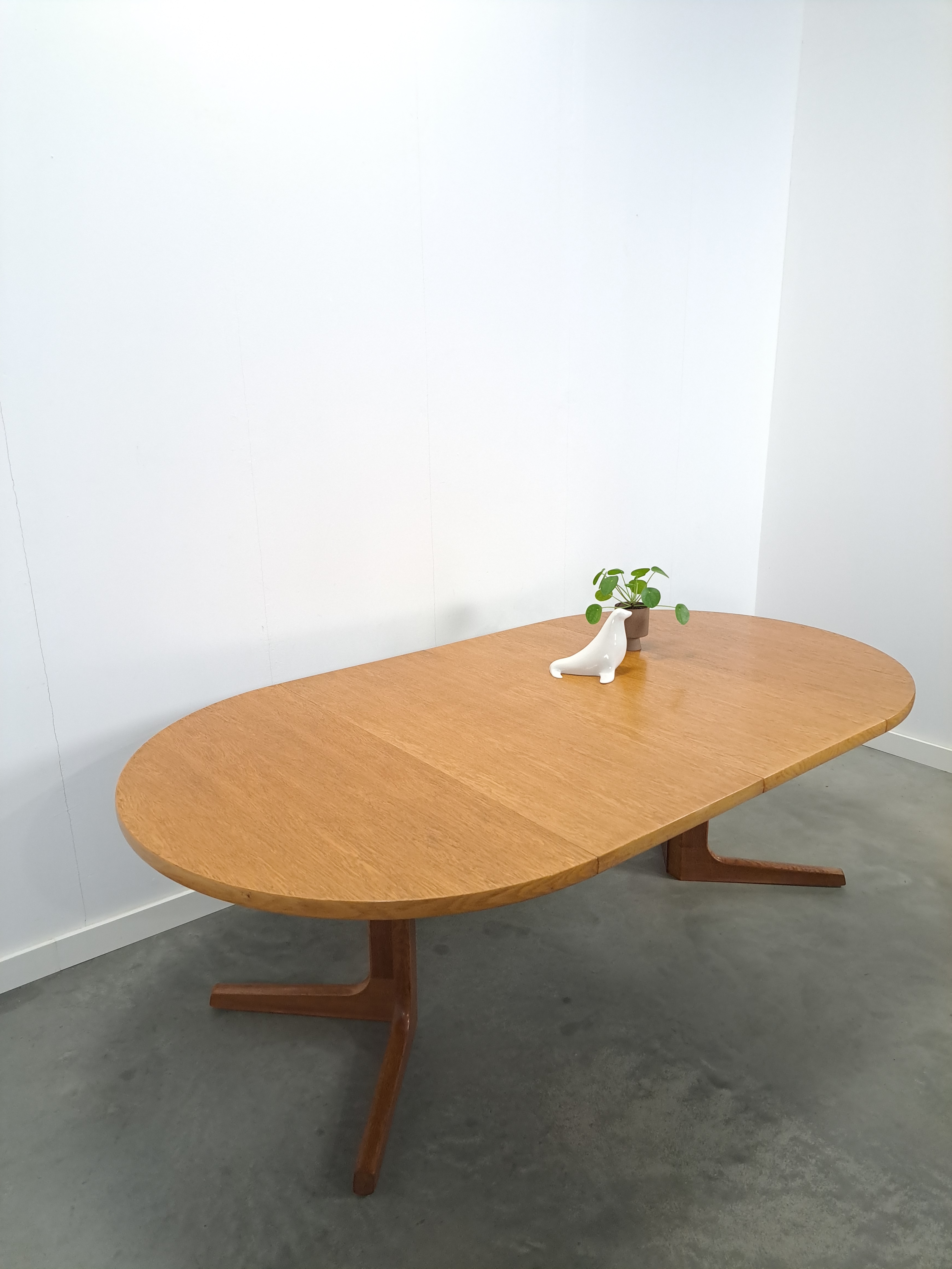 Vintage eiken eettafel. De ronde tafel heeft een dik eiken fineer blad en mooie houten poten. De eettafel heeft een rond een fijn formaat en de tafel kan eenvoudig uitgeschoven worden tot een extra grote ovale eettafel. De tafel heeft 2 losse bladen, om de tafel te vergroten.