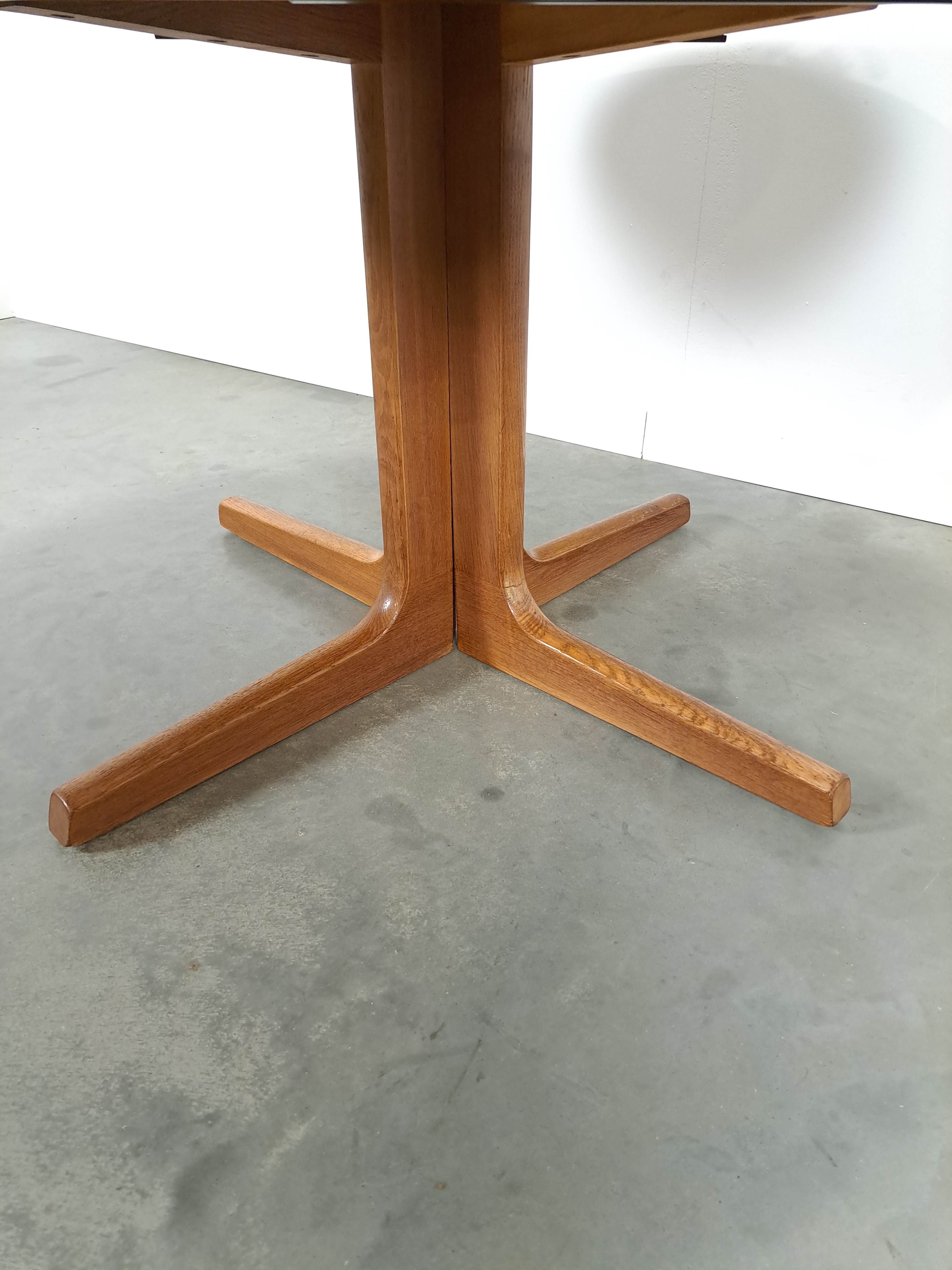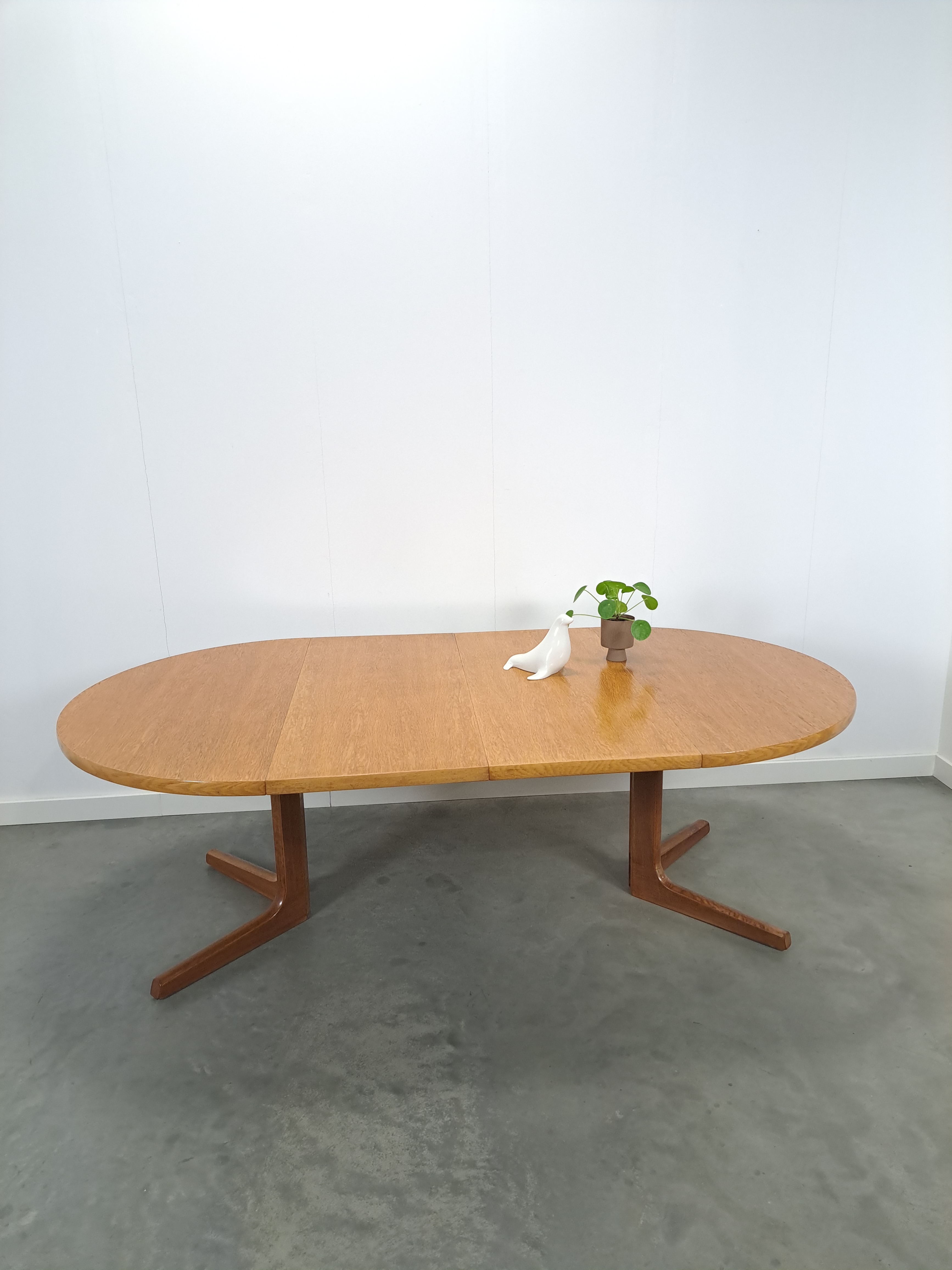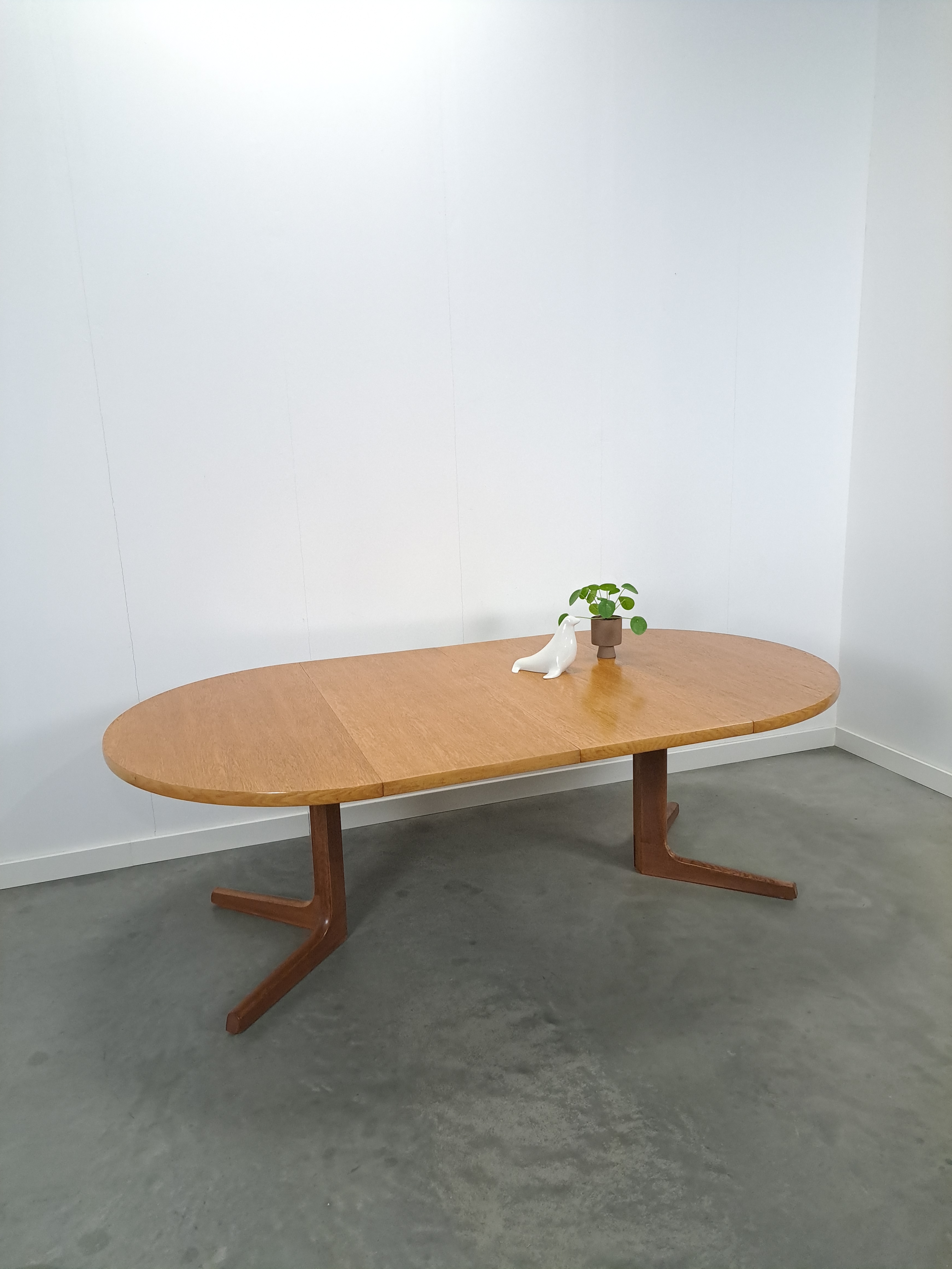 Vintage eiken eettafel. De ronde tafel heeft een dik eiken fineer blad en mooie houten poten. De eettafel heeft een rond een fijn formaat en de tafel kan eenvoudig uitgeschoven worden tot een extra grote ovale eettafel. De tafel heeft 2 losse bladen, om de tafel te vergroten.