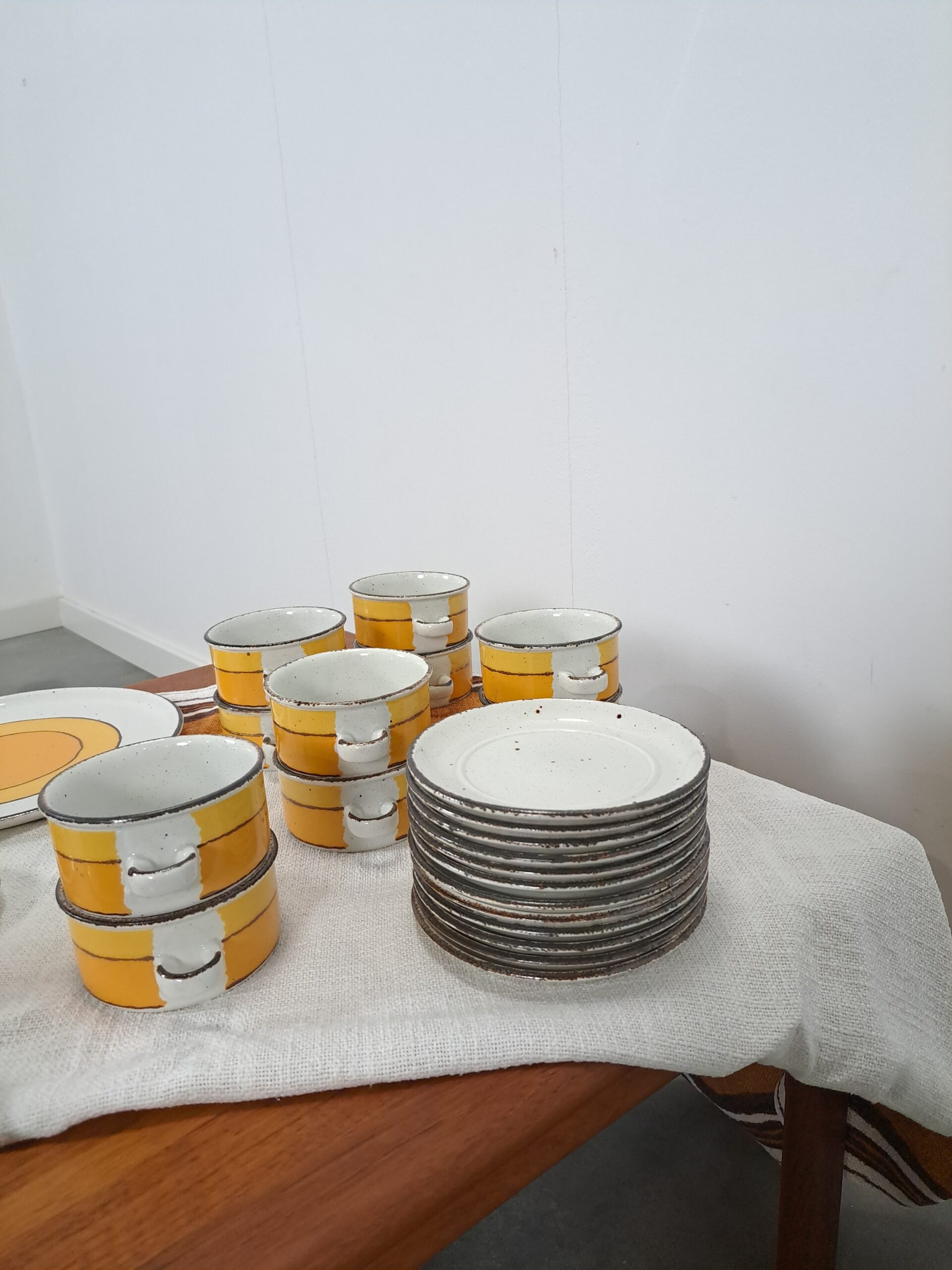 Jaren 70 servies set Midwinter Sun uit Engeland. Het servies is uitgegeven door Stonehenge, Midwinter door Wedgwood group England. Het servies heeft mooie gele, oranje en bruine kleuren. De set bestaat uit 12 soepkommen met 2 oren, 14 onderborden voor de soepkommen, een grote serveerschaal en extra leuk, een bijpassend tafelkleed.