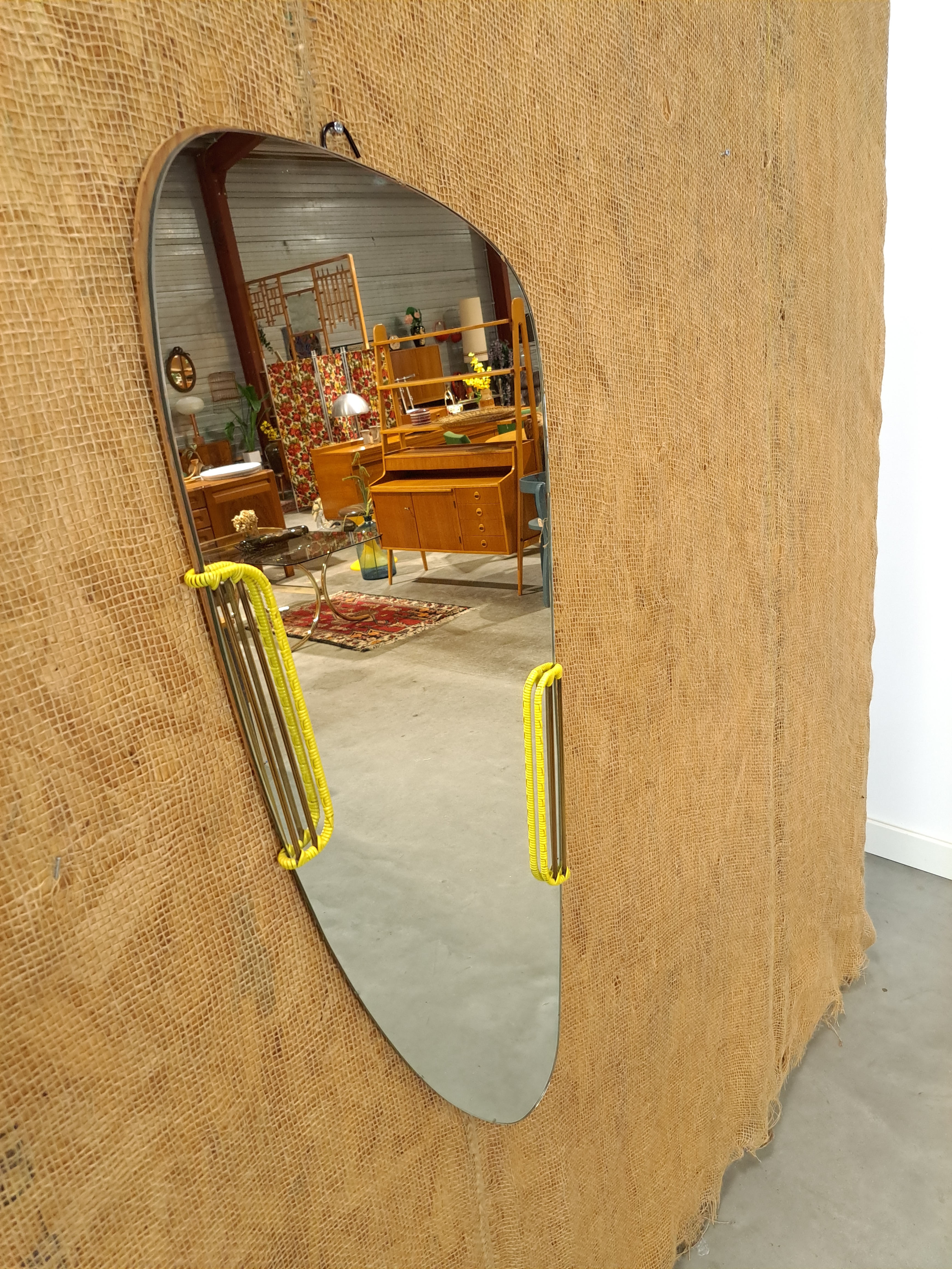 Vintage spiegel uit Oost Duitsland met leuke gele kunststof details.