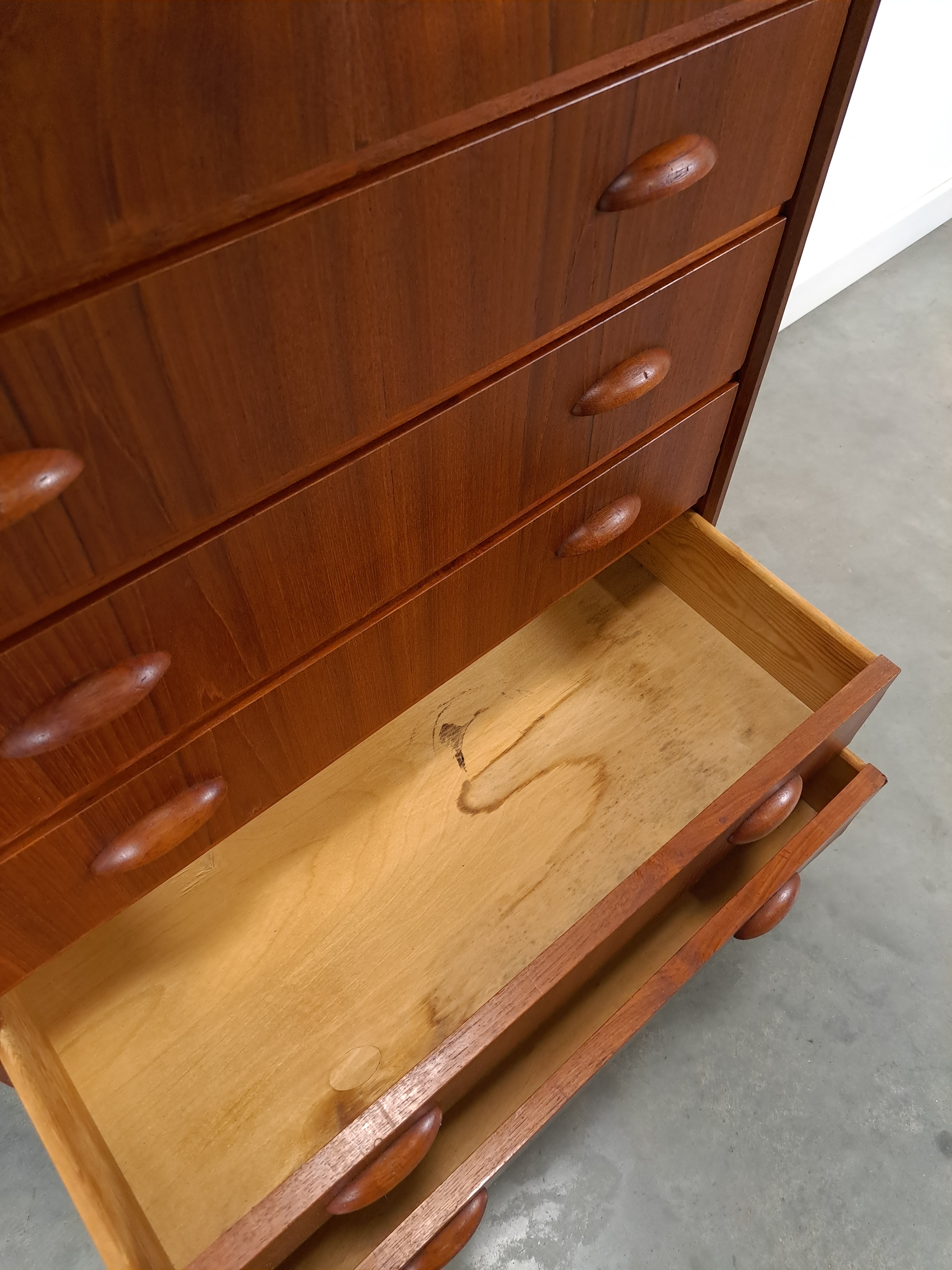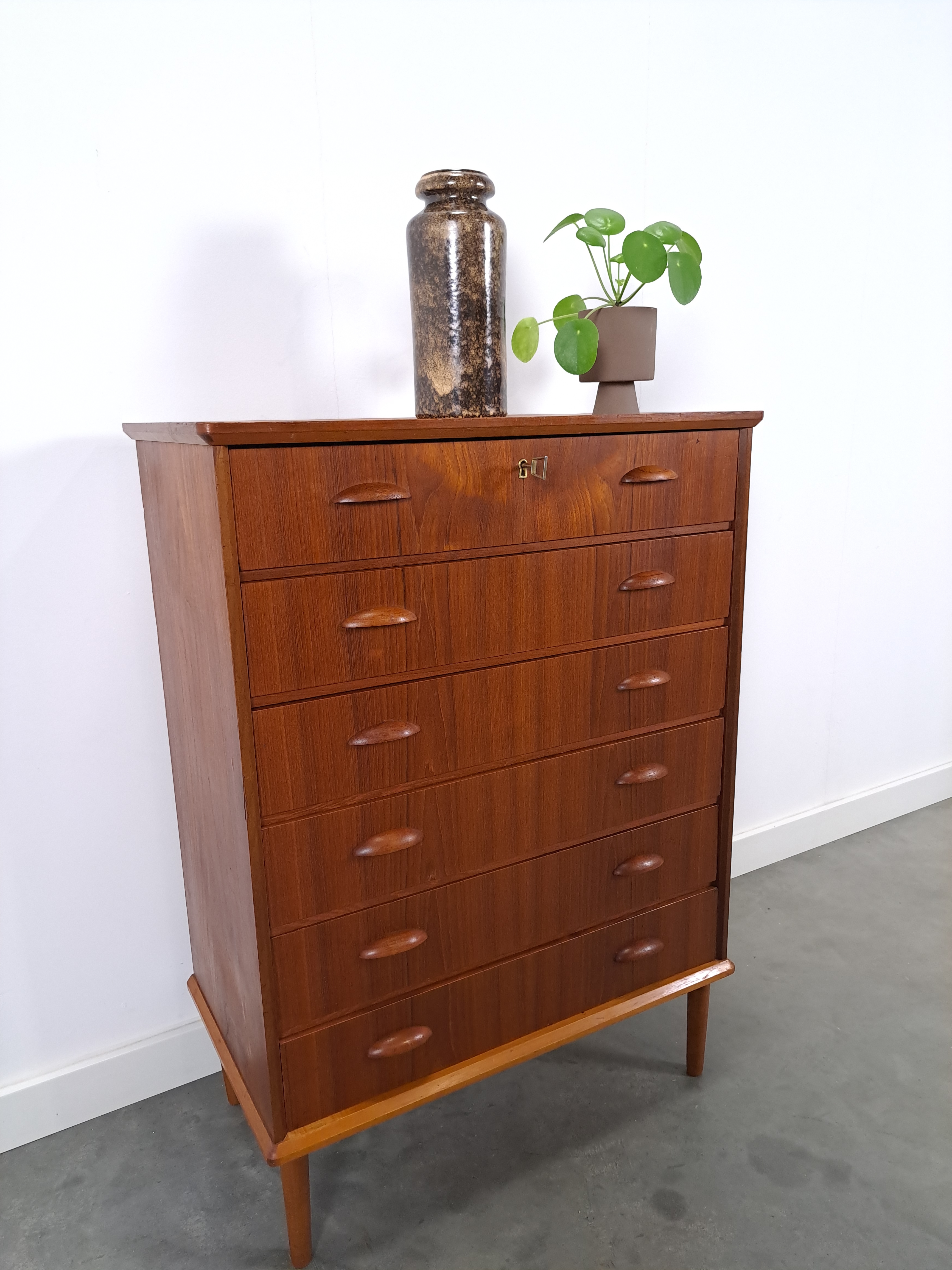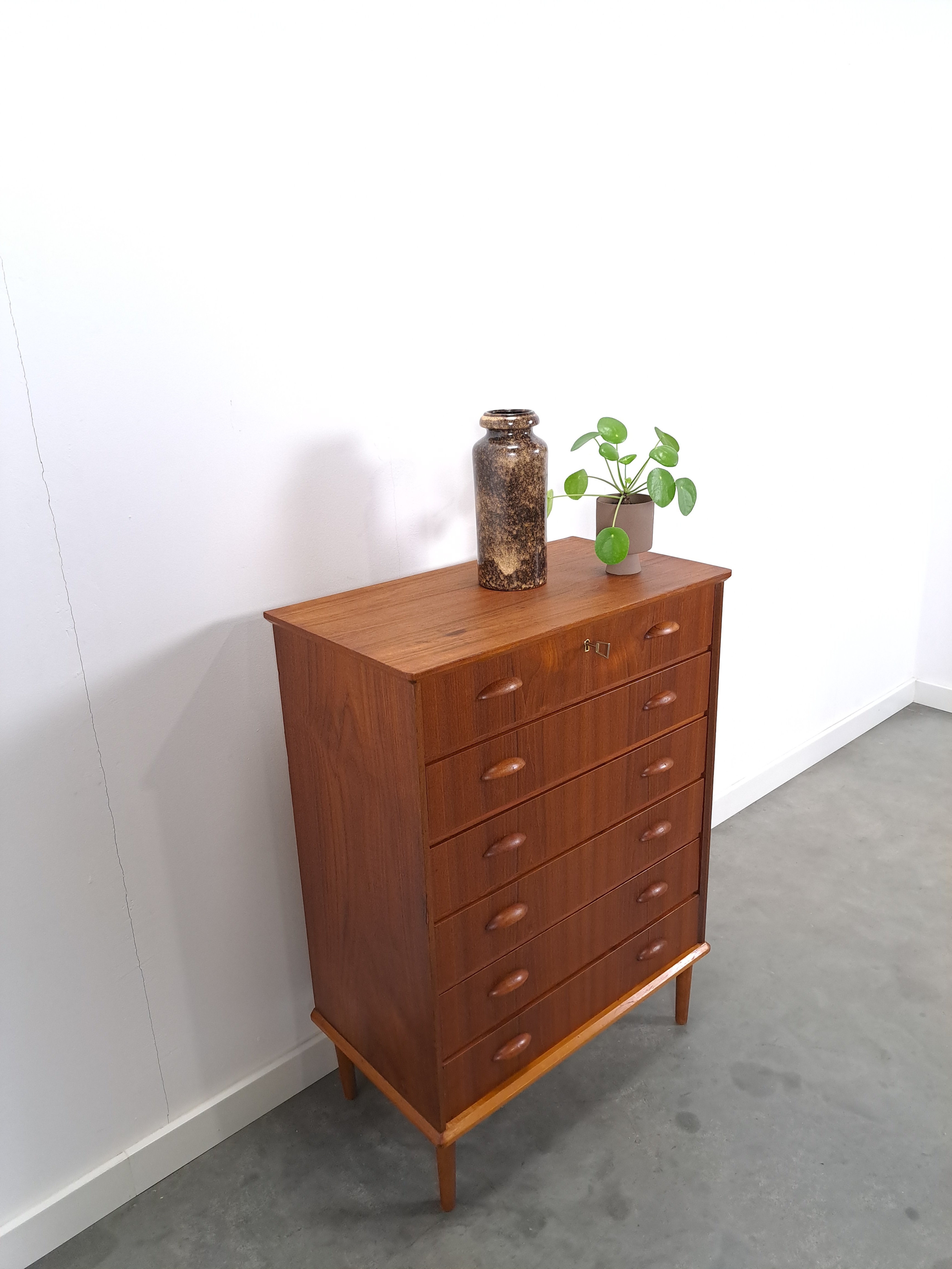 Vintage teak fineer ladekast. De ladekast komt uit Denemarken en heeft 6 diepe lades en houten handgrepen. Leuk detail is de lichte houtkleur op de onderrand en poten. De teak fineer ladekast is ideaal te gebruiken in de hal of slaapkamer als opbergkast.