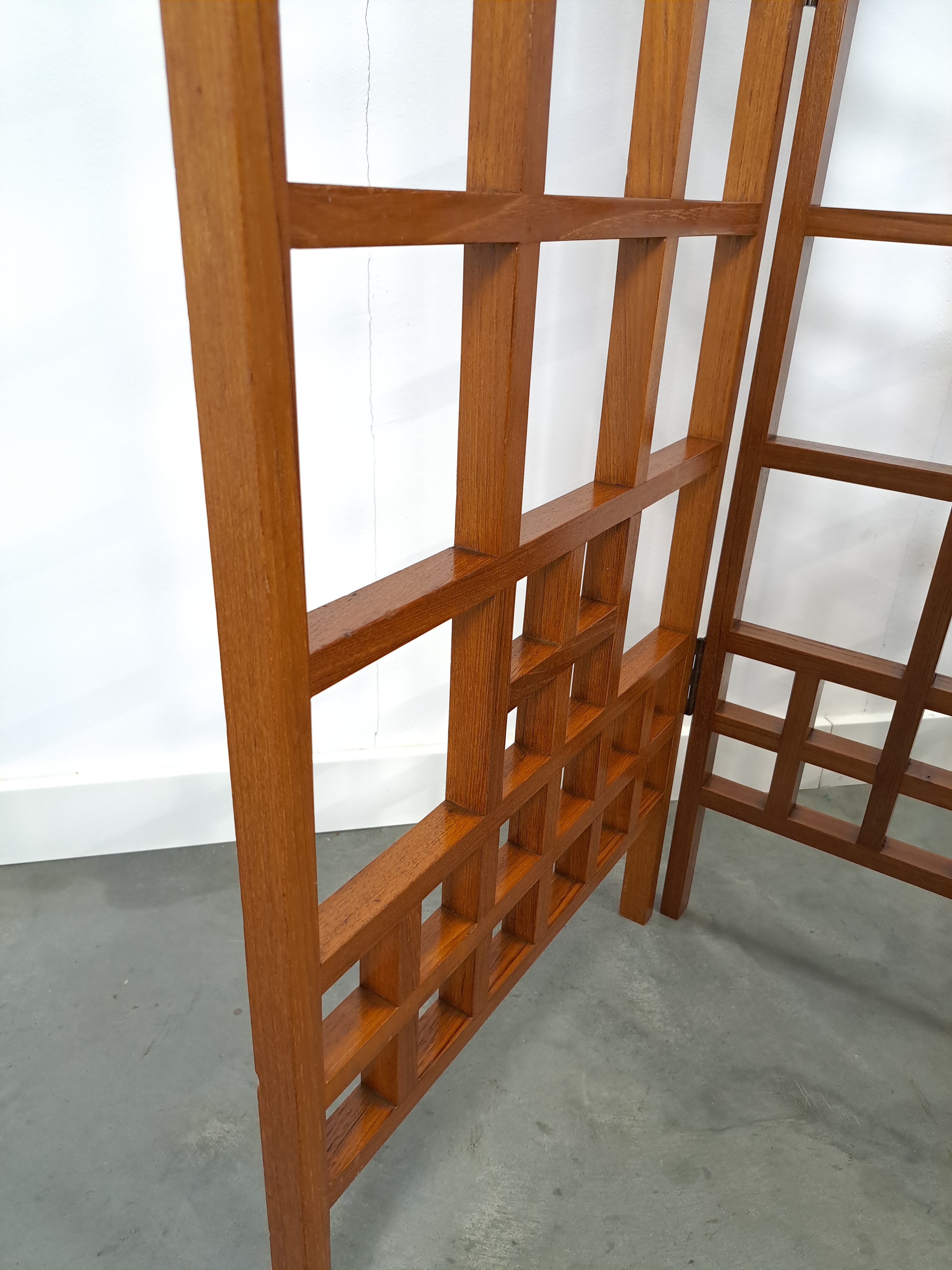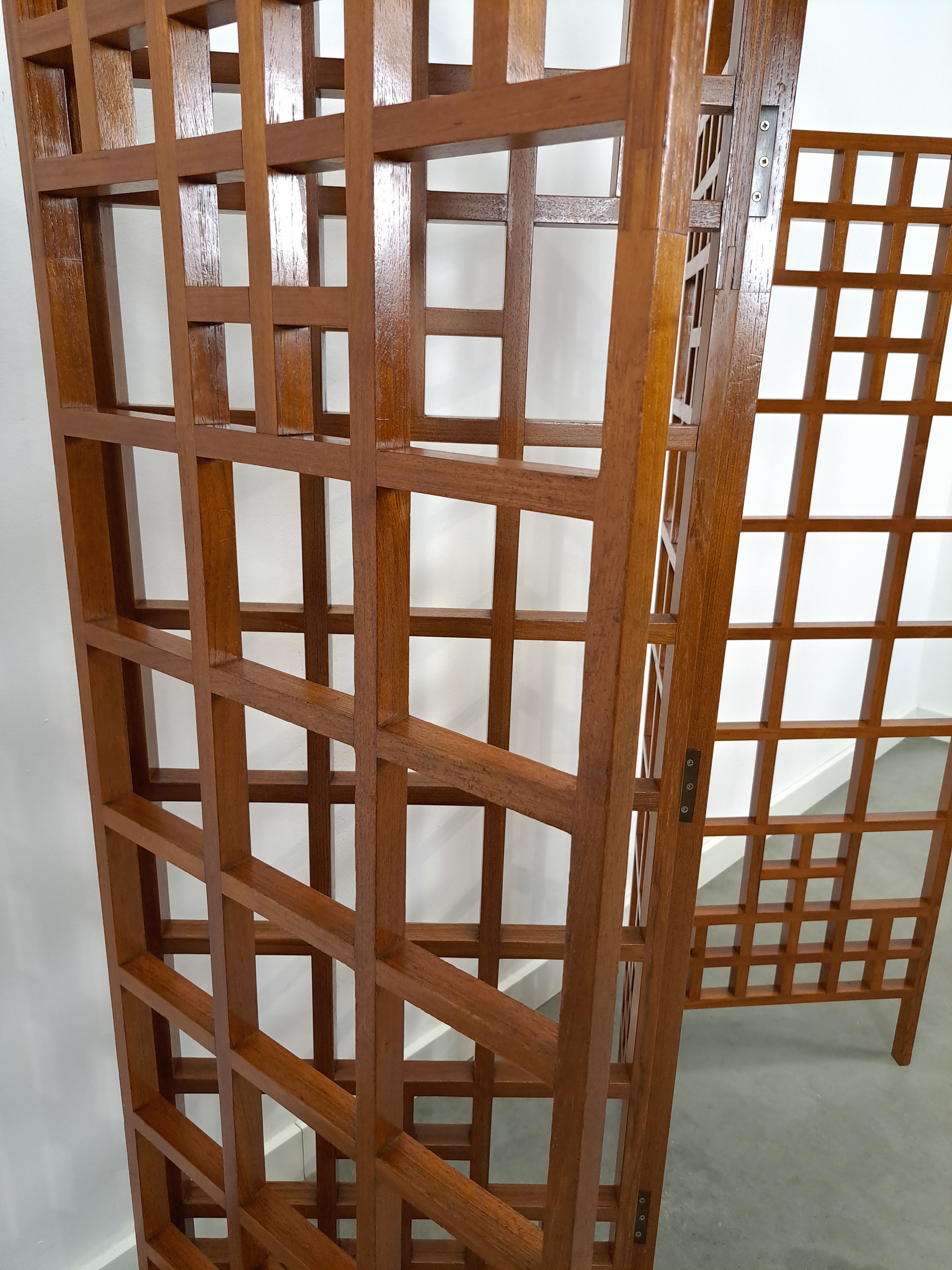 Vintage teakhouten roomdivider. Het kamerscherm bestaat uit 4 delen en is mooi vorm gegeven. Het kamerscherm is ideaal te gebruiken als afscheiding in een woonkamer of werkkamer.