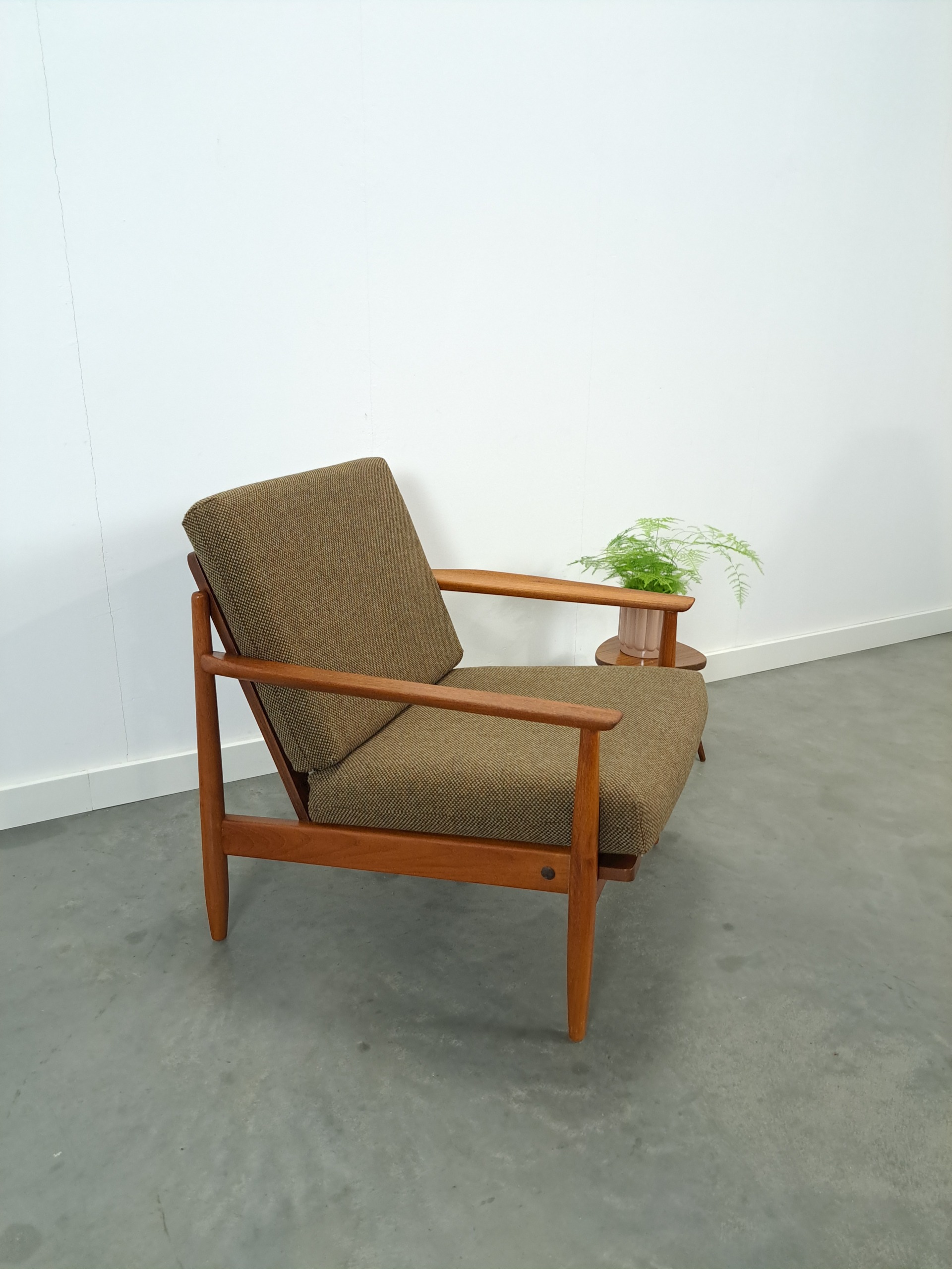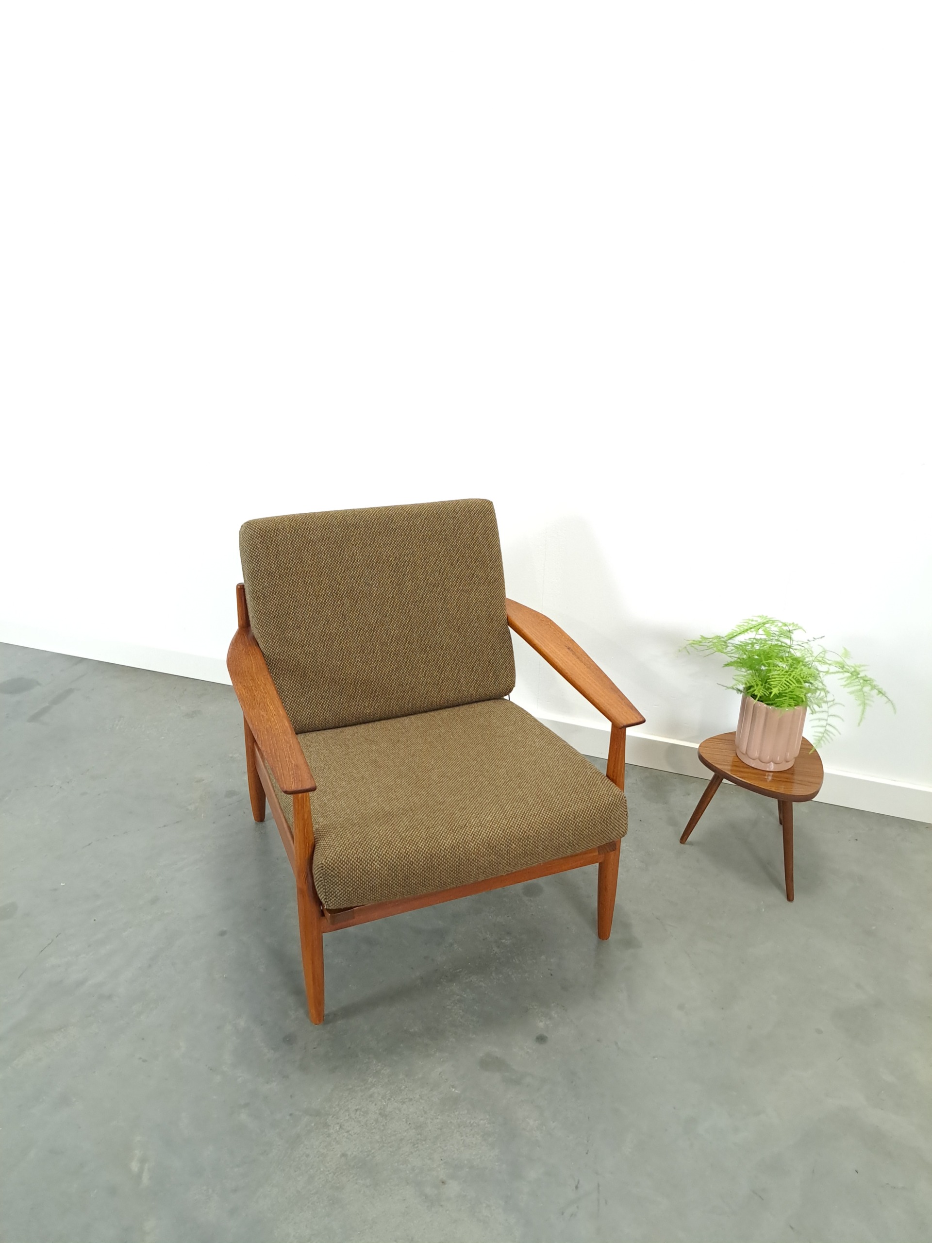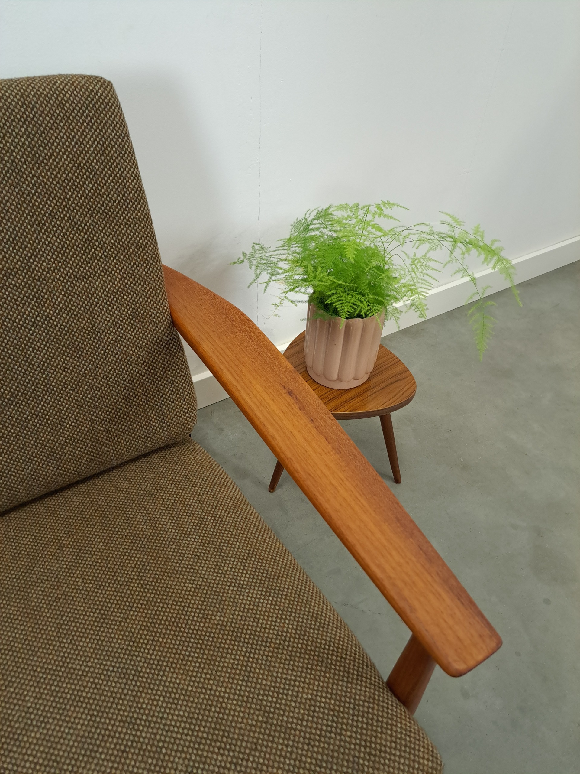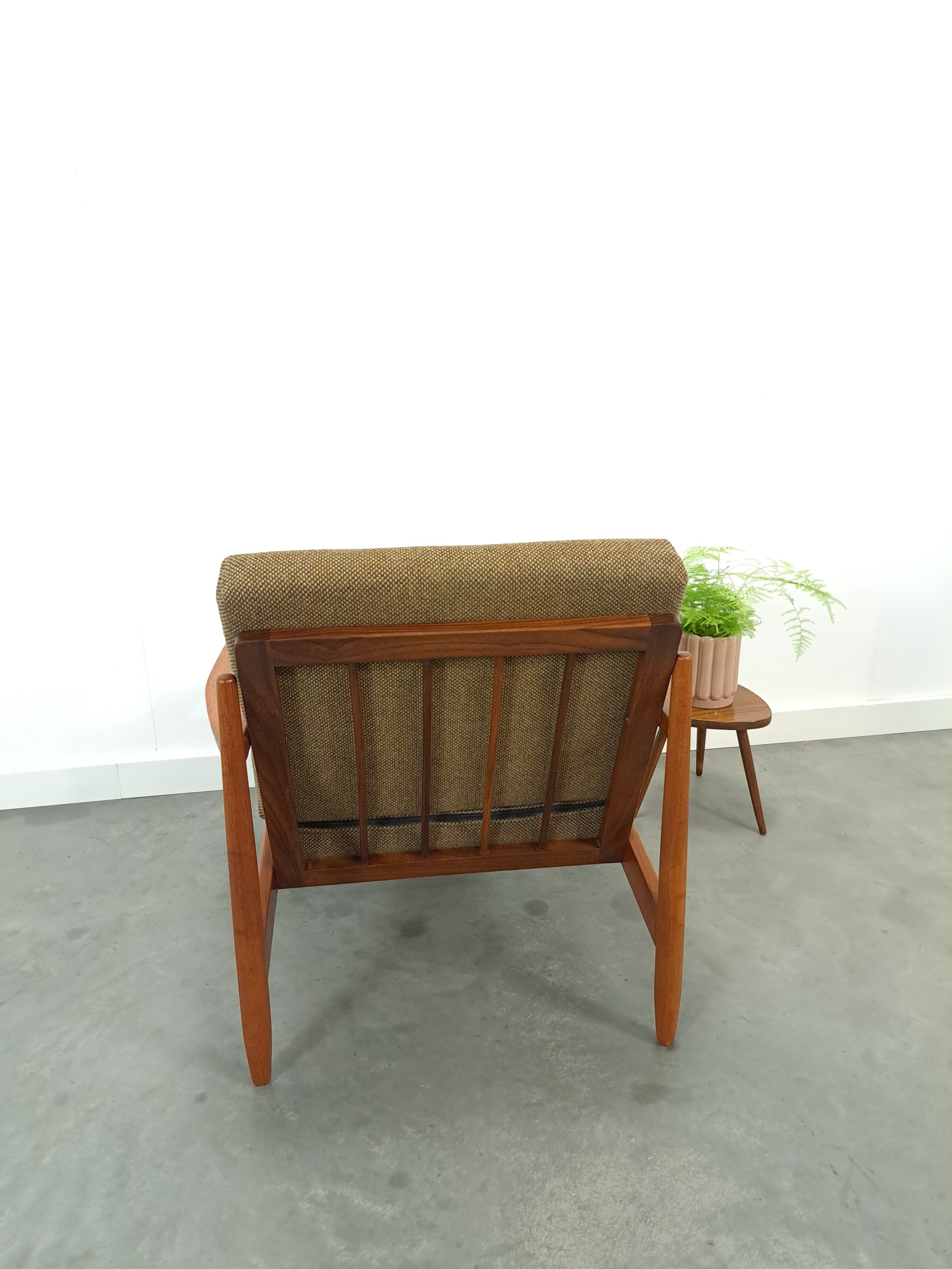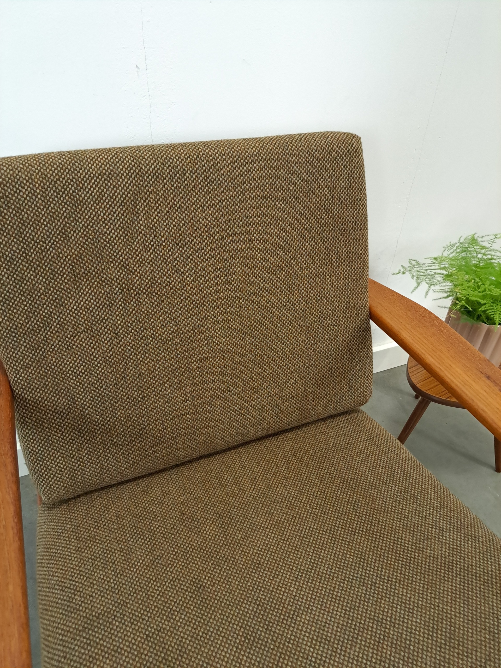 Vintage teakhouten stoel. De fauteuil komt uit Scandinavië en heeft een stijlvol strak ontwerp. De stoel heeft een teakhouten frame en de kussens hebben een bruin, grijs, beige gemêleerde wollige stof.